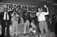 몇 사람은 앞에서 기타를 치고 나머지 사람들은 구호를 외치며 노태우 정권을 비판하고 있는 모습