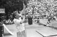 연좌시위를 벌이는 시위대에게 투쟁의지를 북돋아주고 있는 주도자들의 모습