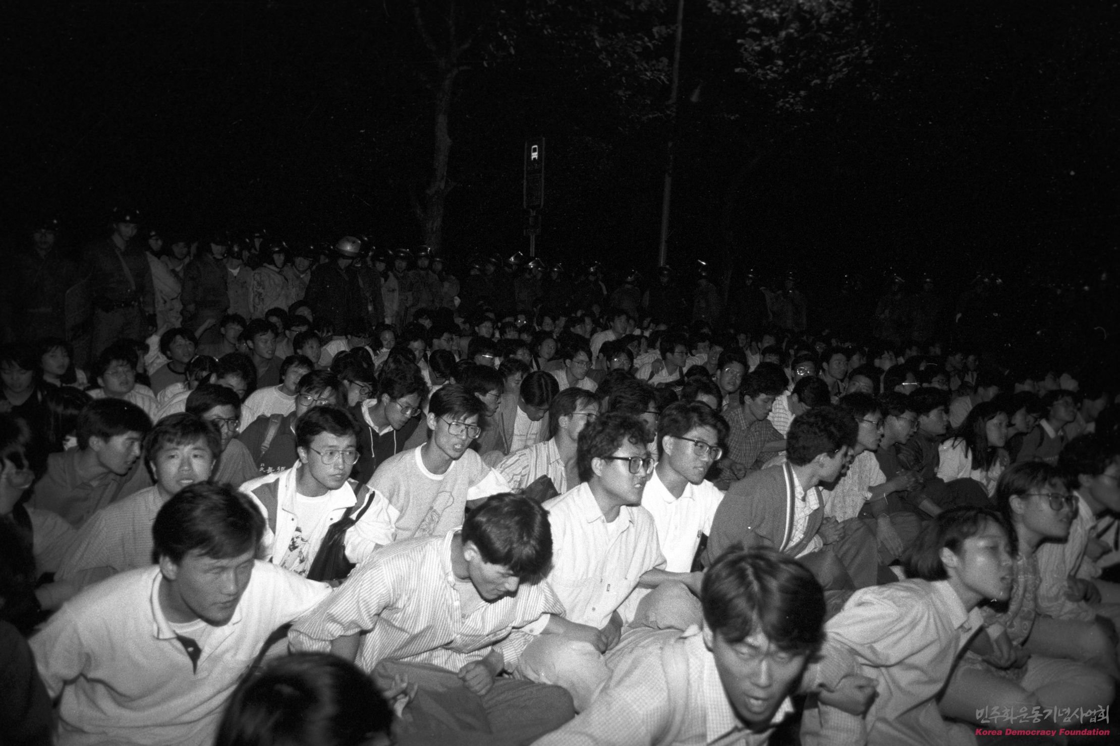 스크럼을 짜고 한국원군 관련 연좌시위를 하는 학생들