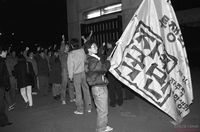 제3회 임수경 통일 문학상 시상식에 열리는 연세대 에서 깃발을 흔드는 사람들