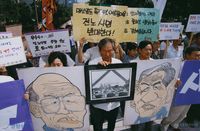 종로에서 국가보안법 철폐 시위를 진행중인 범민족대회 통일선봉대 학생들