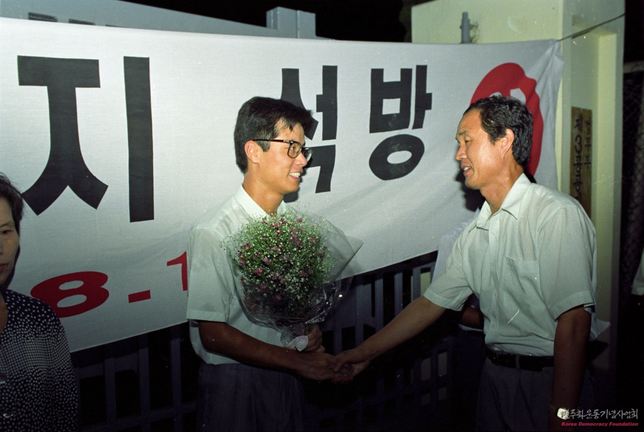 강기훈의 석방을 축하하며 악수를 나누는 모습