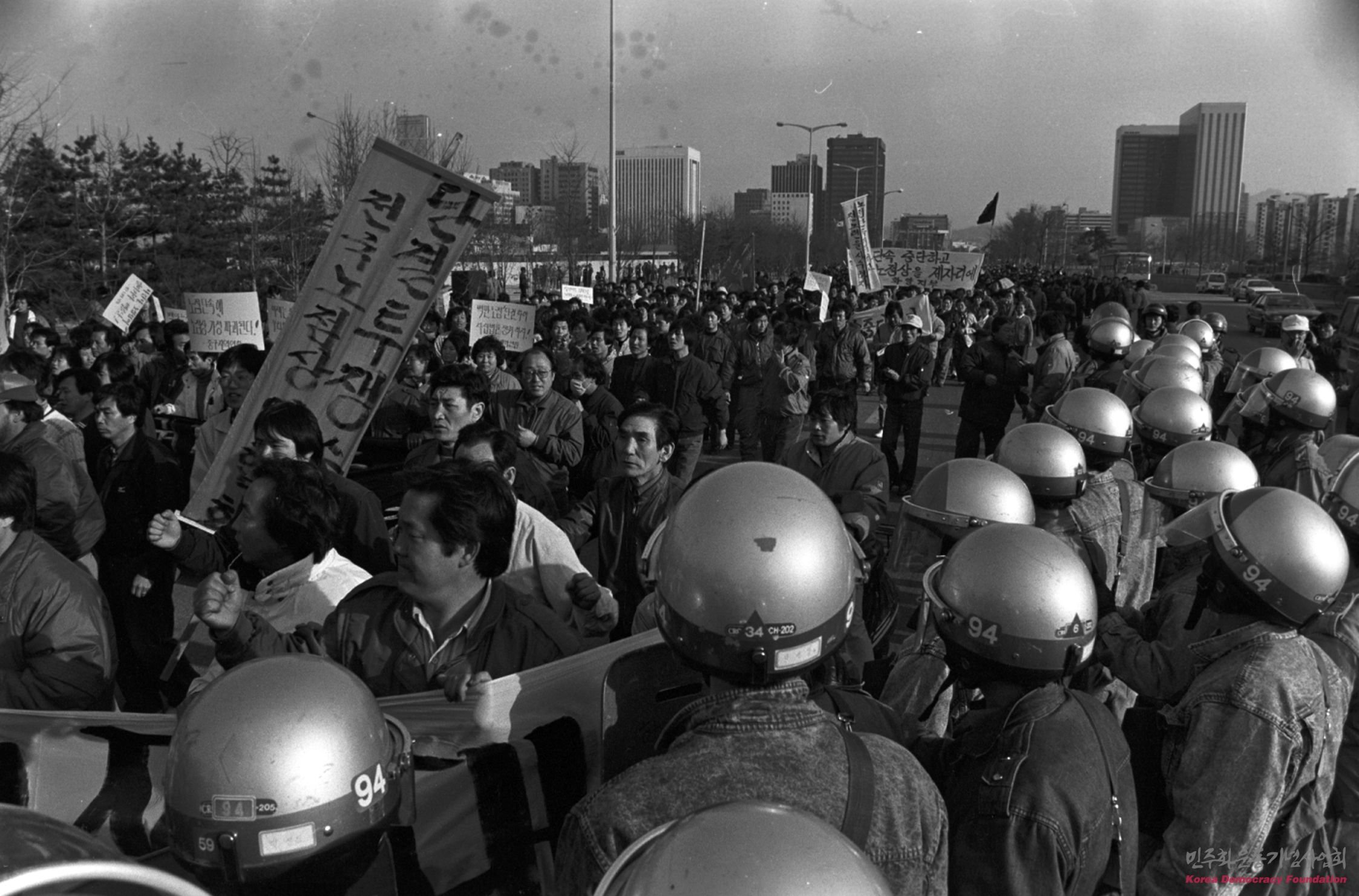 서철협의 시위대와 전경들이 대치하고 있는 모습