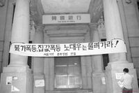 한국은행 앞에 내걸린 "물가 폭등, 집값폭등 노태우는 물러가라" 플래카드