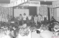 문익환 목사 평양방문 보고 및 환영대회 참가자들이 피켓을 들고 구호를 외치는 모습