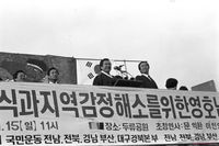 "자주, 평화, 통일 민족회의 창립대회" 에서 사물놀이를 행하는 모습