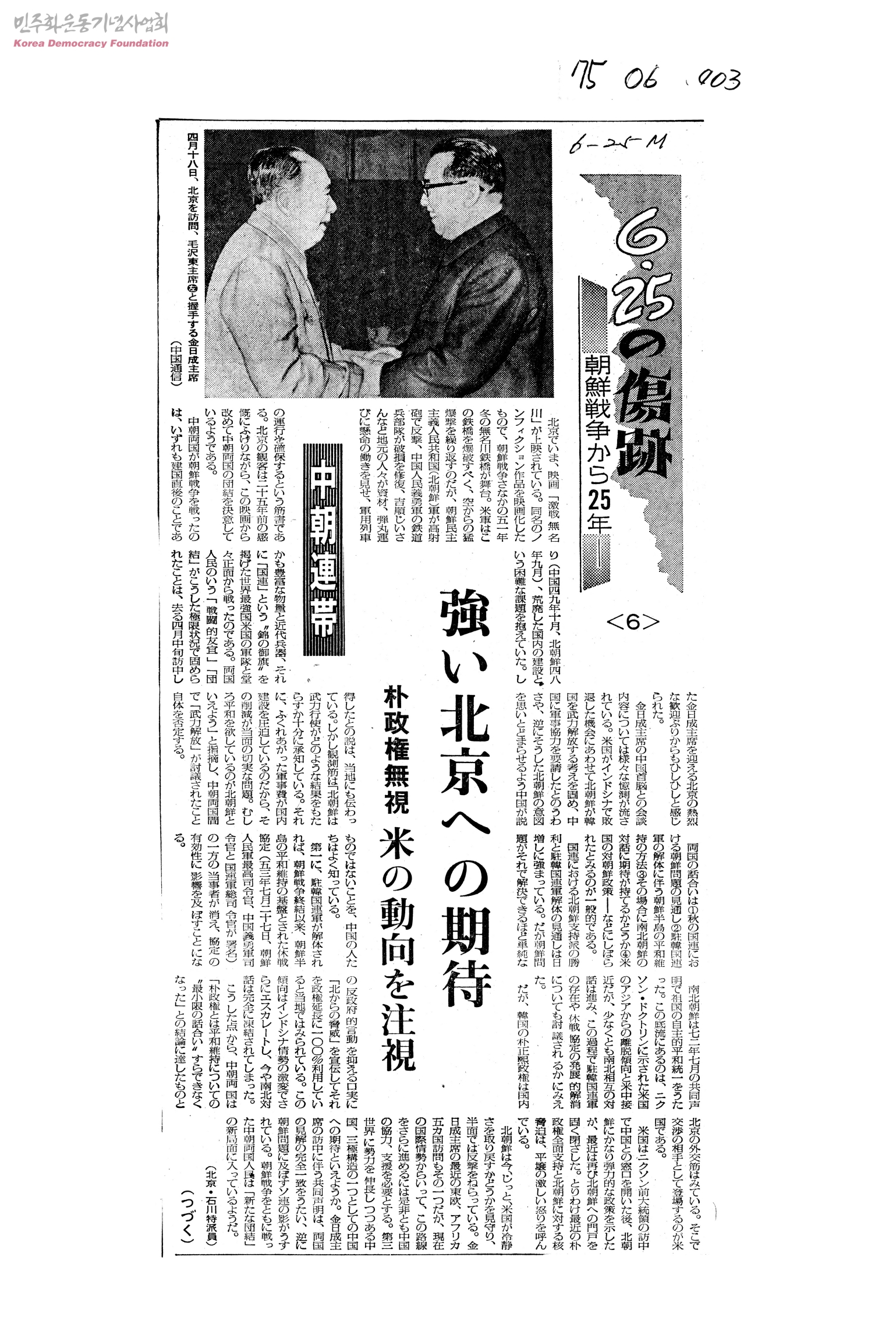 [신문스크랩]6.25の傷跡 朝鮮戰爭から25年<6> - 强い北京への期待
