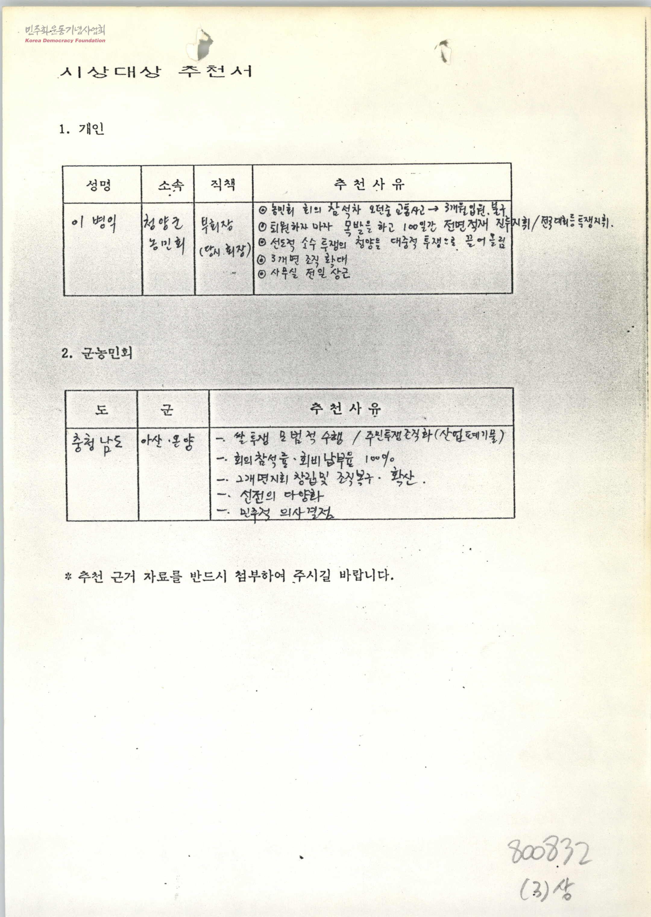 - 1. 개인 - 이병익 청양군농민회 부회장, 2. 군농민회 - 충청남도 아산 온양