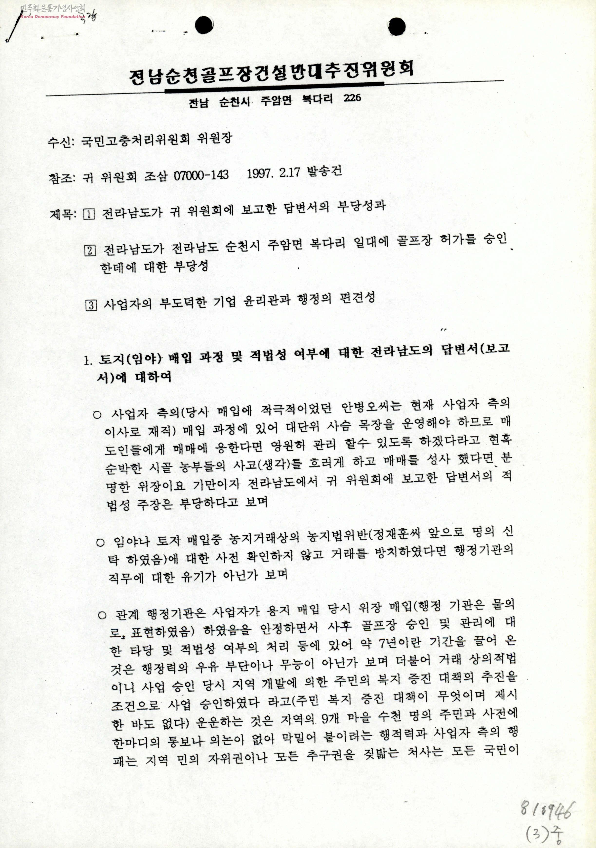 - 1. 전라남도가 국민고충처리위원회에 보고한 답변서의 부당성 2. 전라남도가 전라남도 순천시 주암면 복다리 일대에 골프장 허가를 승인한데에 대한 부당성 3. 사업자의 부도덕한 기업 윤리관과 행정의 편견성