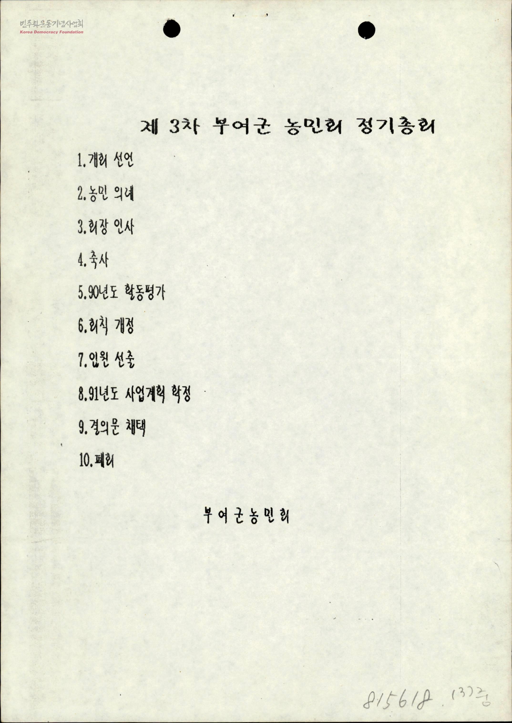 - 제3차 부여군 농민회 정기총회 - 개회선언 - 농민 의례 - 회장 인사 - 축사 - 90년도 활동평가 - 회칙 개정 - 임원 선출 - 91년도 사업계획 확정 - 결의문 채택 - 폐회