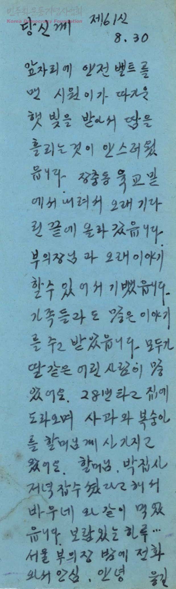 - 박용길장로가 서울구치소에 수감 중인 남편 문익환목사에게 보내는 서신(제61신)으로 부의장님과 오래 얘기하였다는 내용