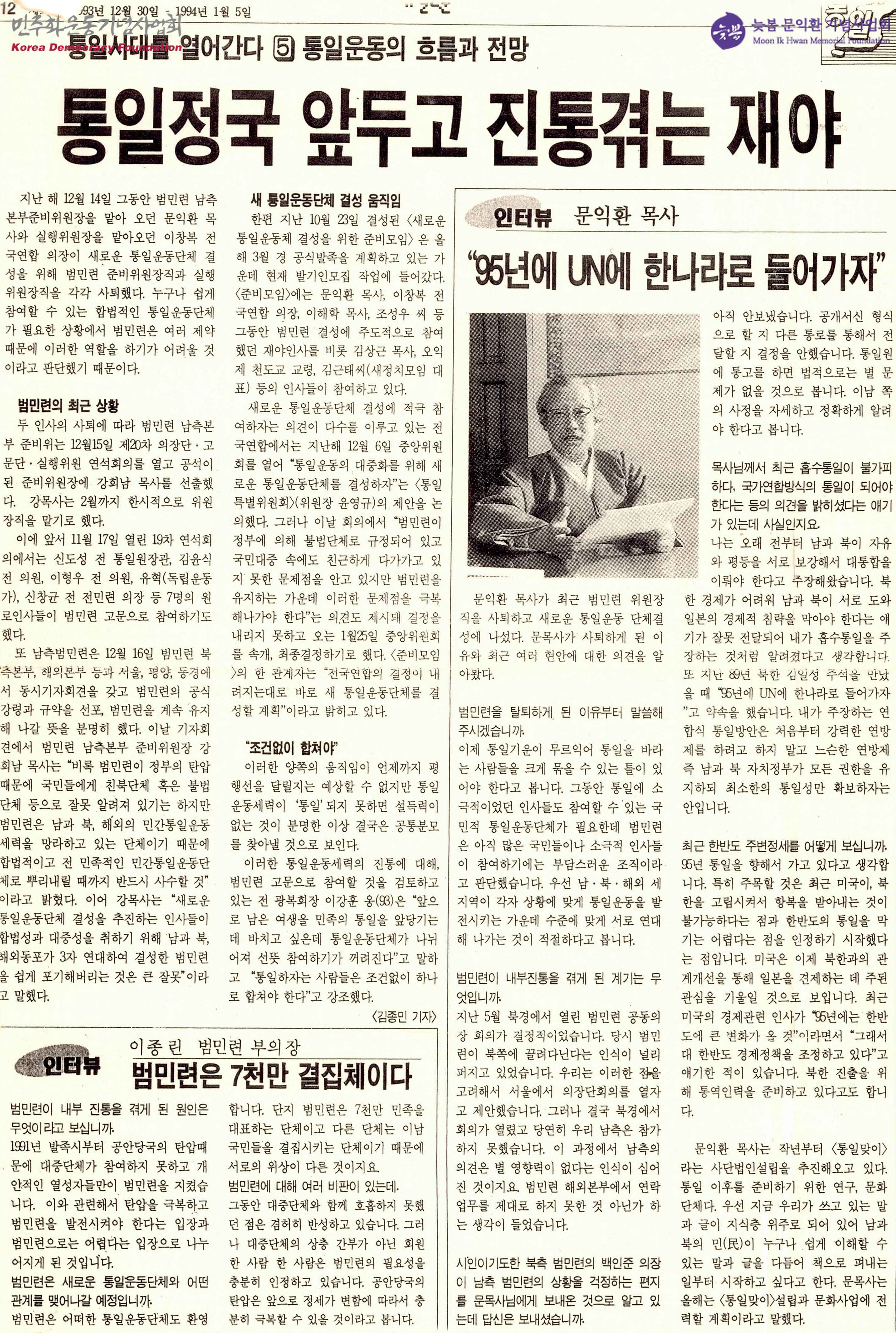 - 범민련에 관한 이야기와 문익환목사 인터뷰, 이종린 범민련 부의자 인터뷰가 실린 기사.