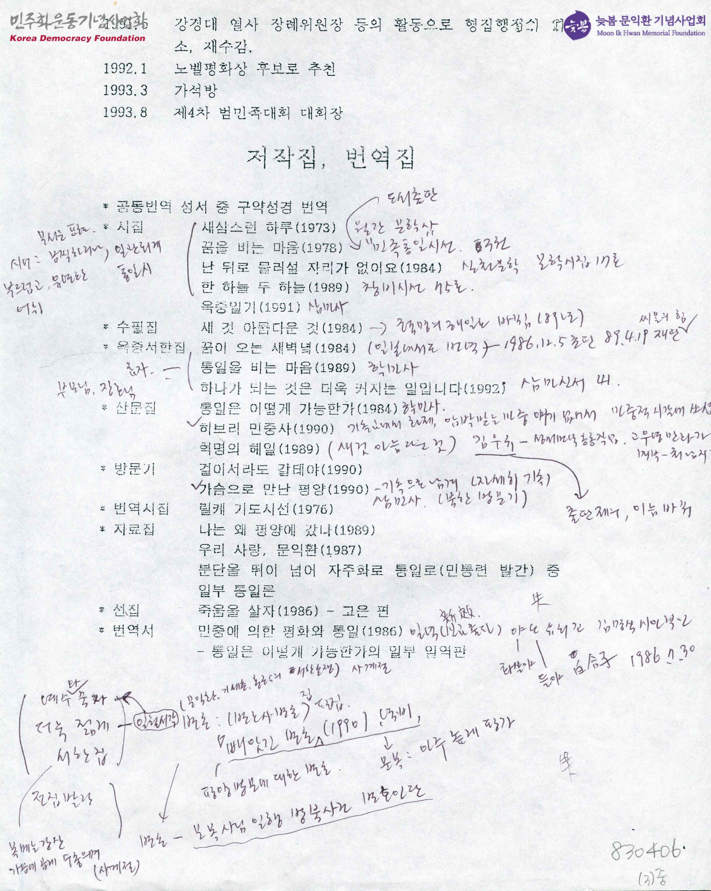 - 문익환 목사의 짧은 약력과 저작집, 번역집이 연도별로 나와있는 인쇄물. 작자 미상의 필체가 책의 출판사와 간단한 메모가 적혀있음.