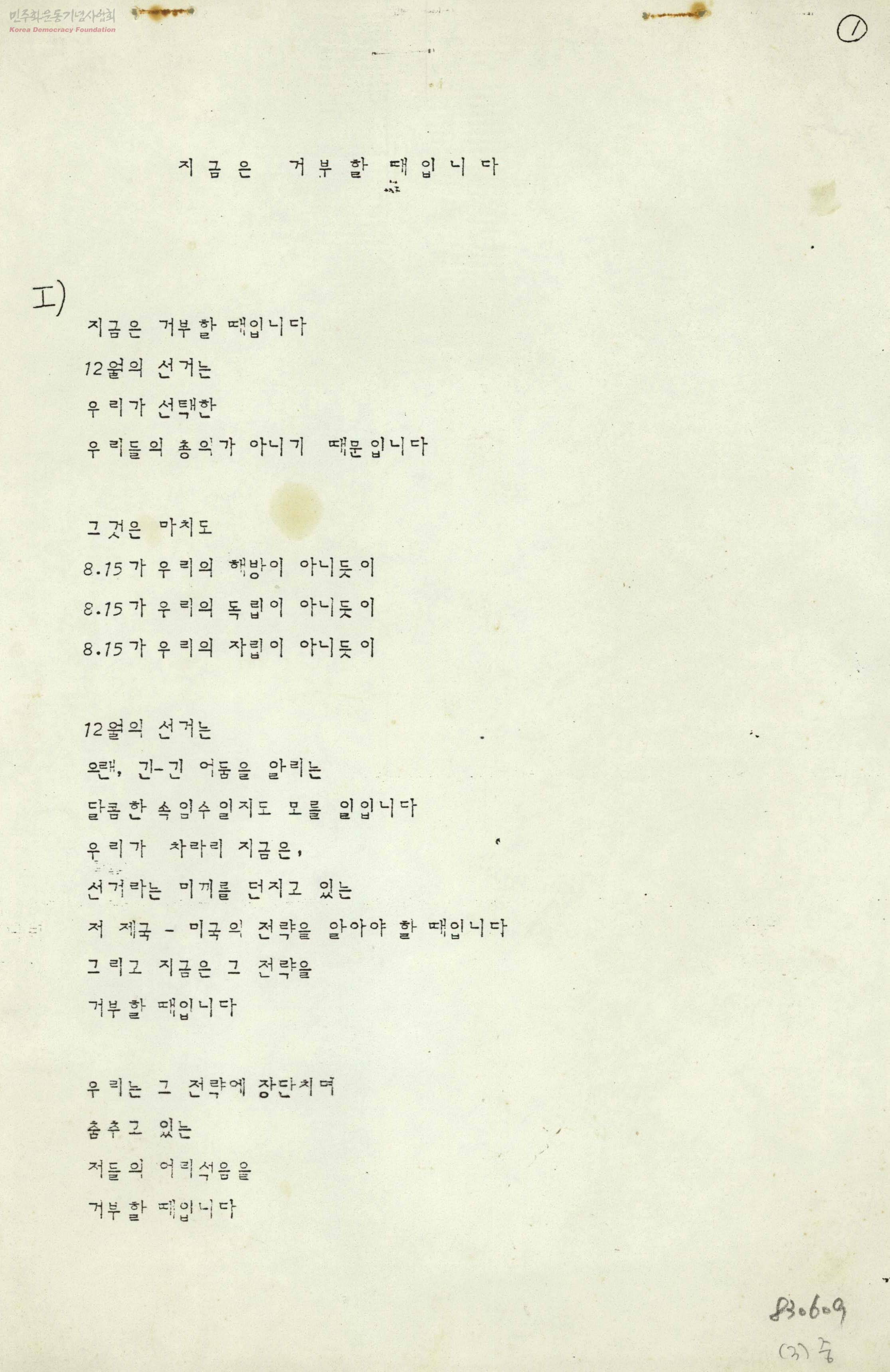 - 시문학 ' 지금은 거부 할 때입니다'. 노태우 대통령후보 출마에 대한 비판의 내용