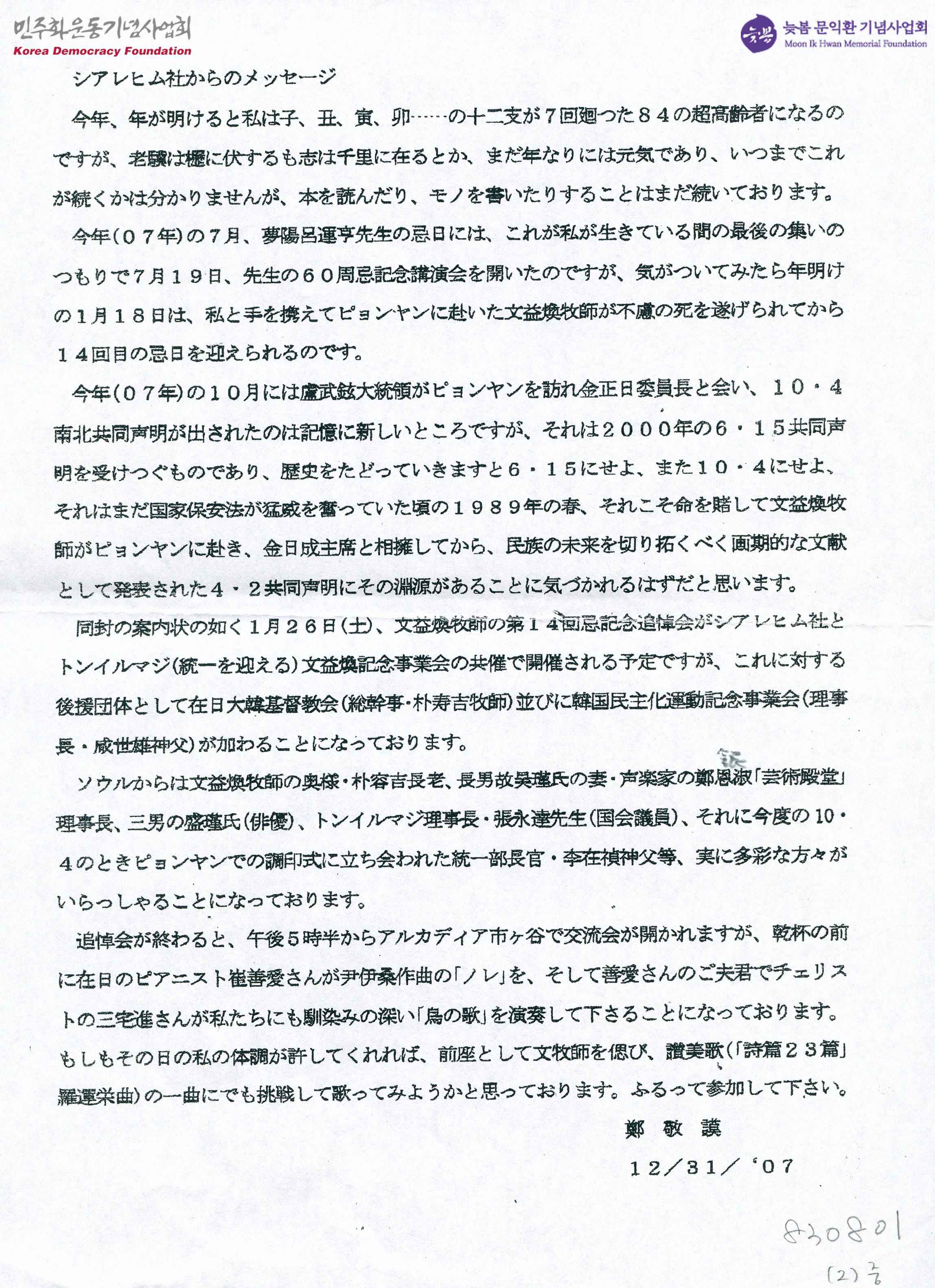 - 1월26일 문익환목사의 14주기 기념추모회가 씨알의 힘사와 통일맞이 문익환목사기념사업회의 공동주최로 개최됨.