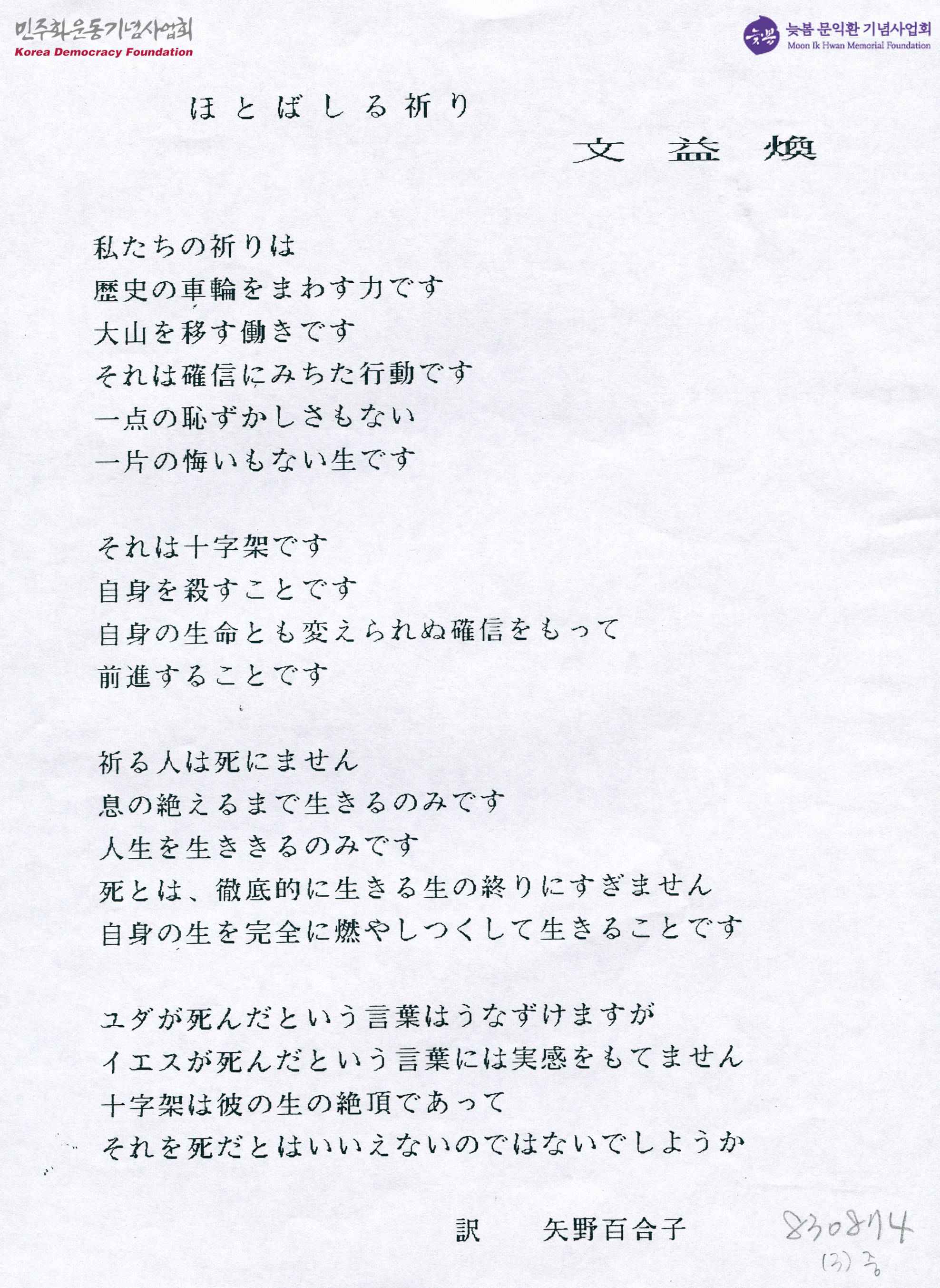 - 矢野百合子가 번역한 문익환목사의 'ほとばしる祈り'.