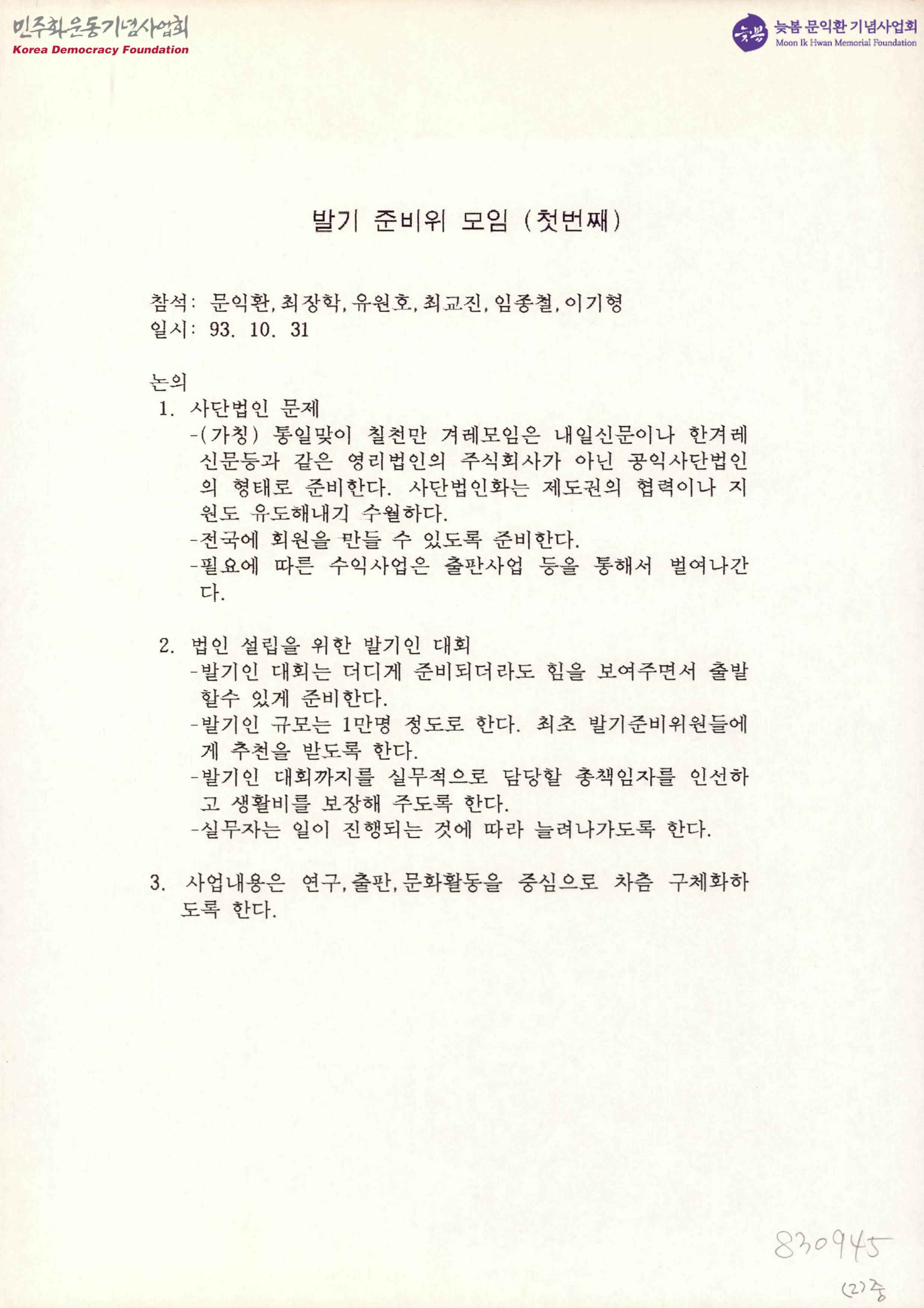 - 발기준비위원회의 모임(첫번째). 사단법인 문제, 법인 설립을 위한 발기인 대회, 사업내용 논의.