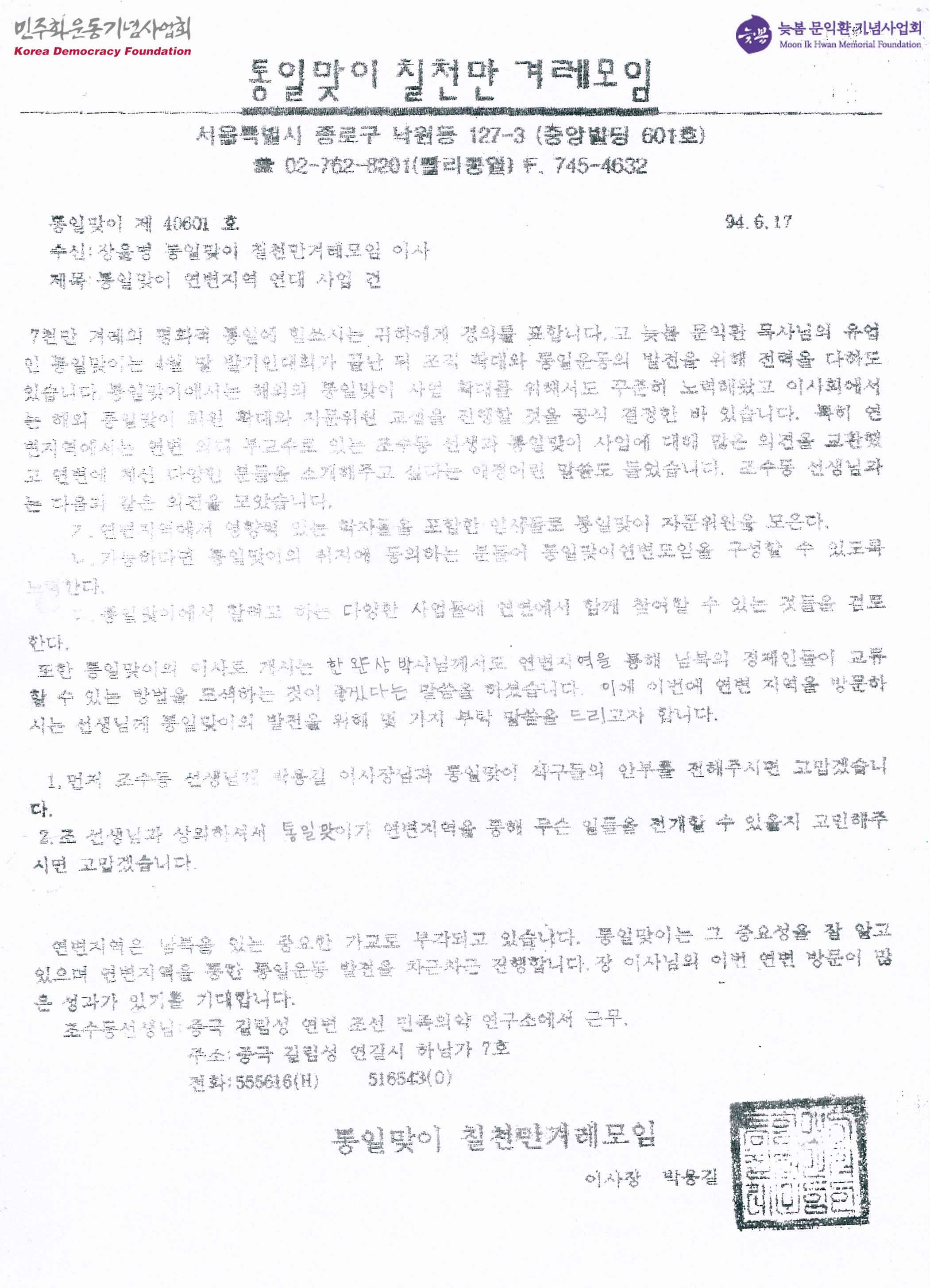 - 통일맞이 칠천만 겨레모임 이사장 박용길이 장윤병 통일맞이 칠천만겨레모임 이사에게 보내는 서류, 통일맞이 연변지역 연대 사업 건에 관한 내용임.