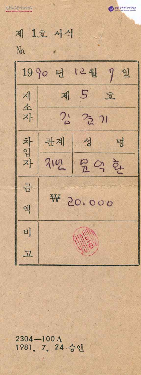 - 1990년 12월 7일문익환목사가 수감중인 임종석, 김준기에게 각각 2만원씩을 영치했다는 내용의 차입증서