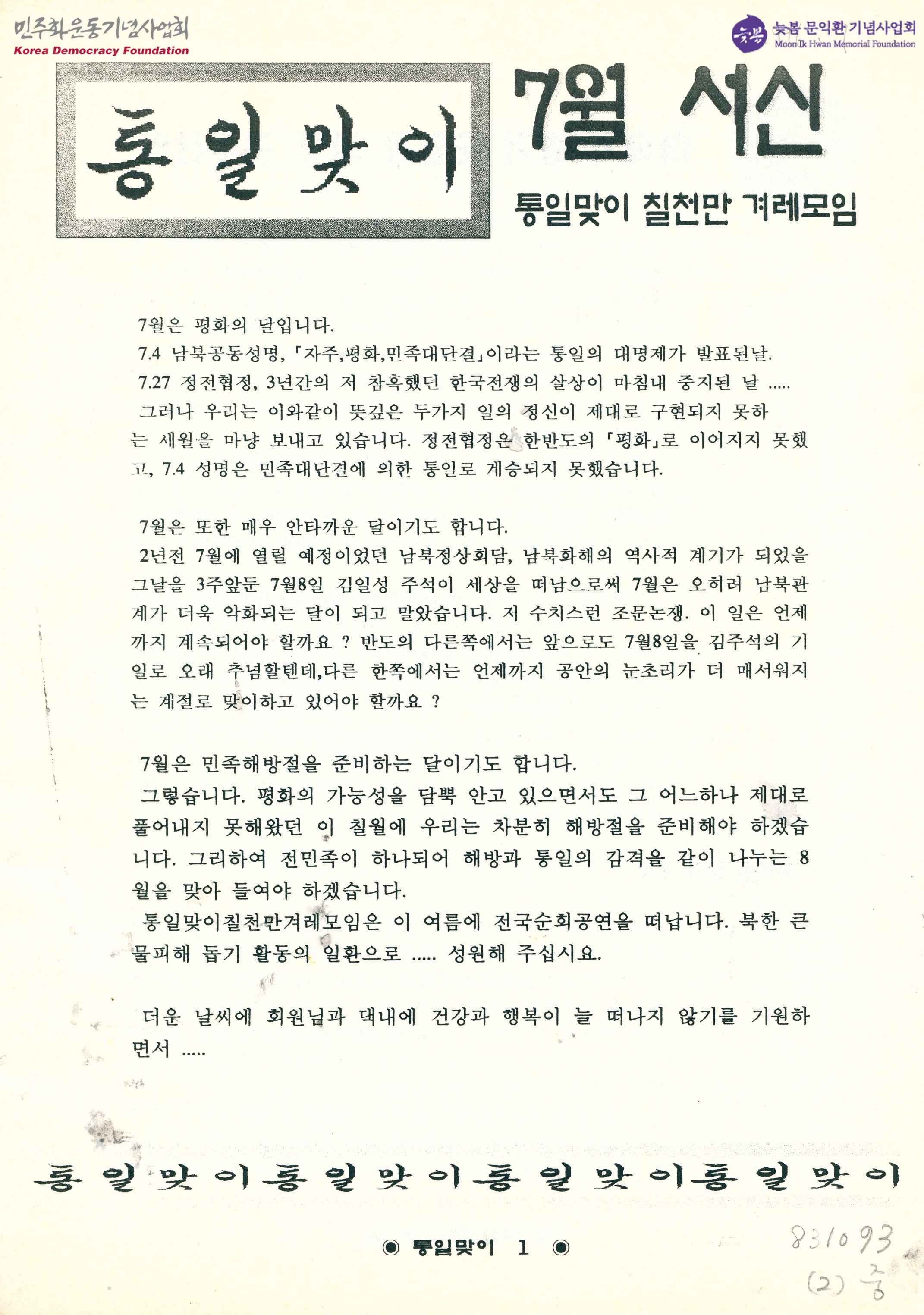 - 통일맞이 서신 1996년 7월호