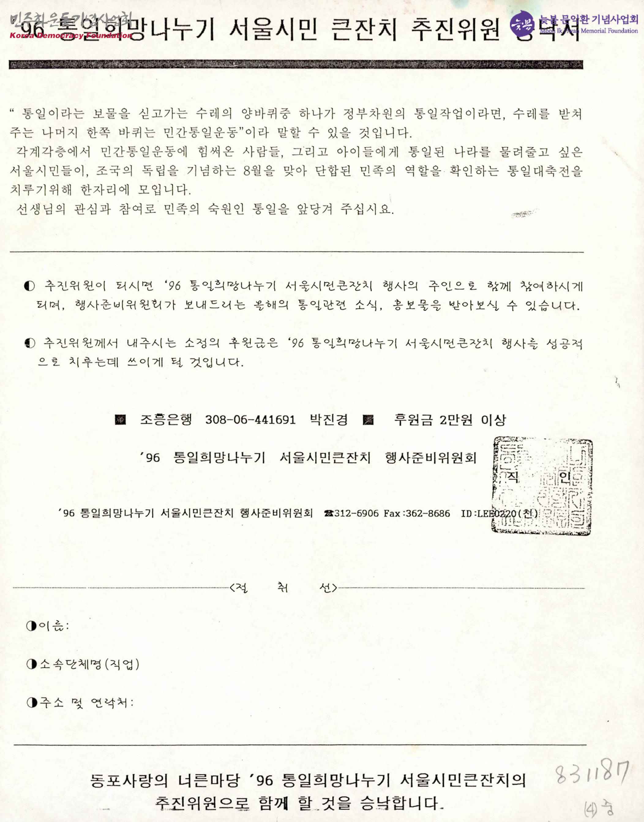- 96 통일희망나누기 서울시민 큰잔치 추진위원 승낙서