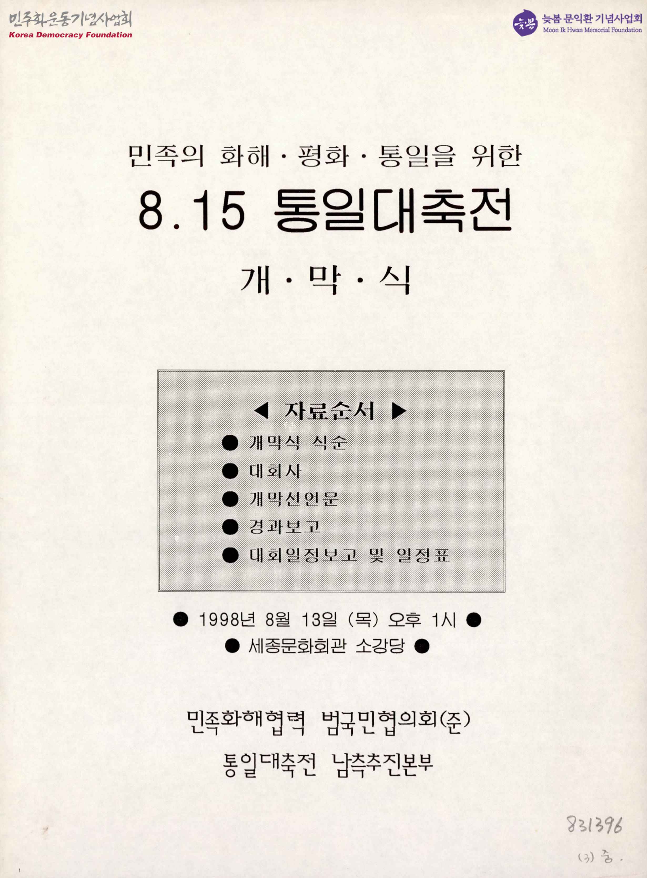 - 민족의 화해 평화 통일을 위한 8.15 통일대축전 개막식 식순과 대회사 등.