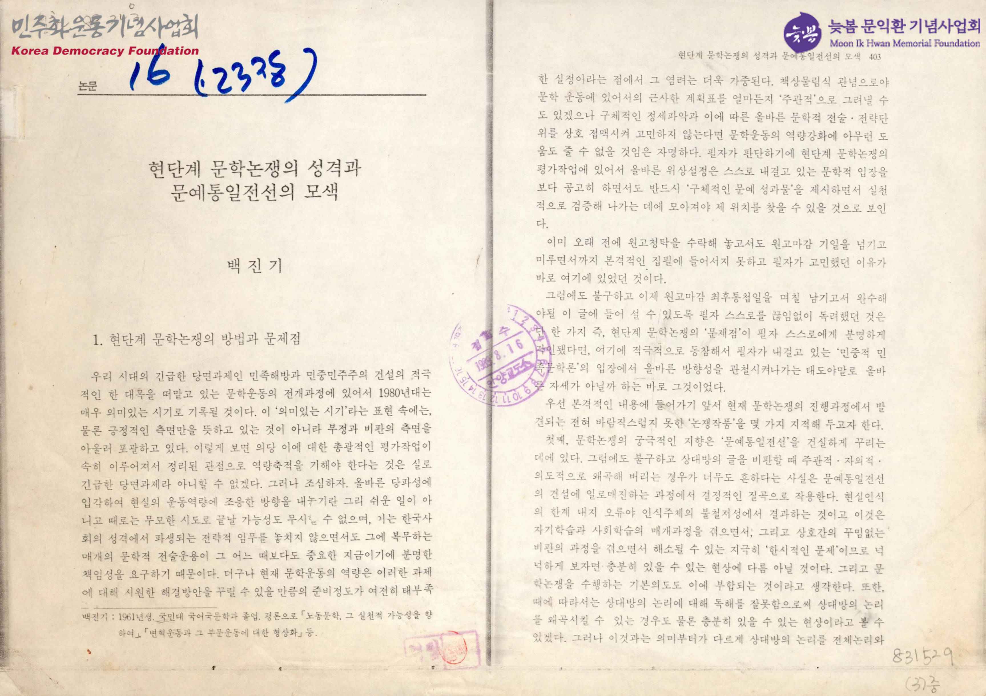 - 백진기의 '현단계 문학논쟁의 성격과 문예통일전선의 모색', 와다하루키의 '남과 북의 벗에게'