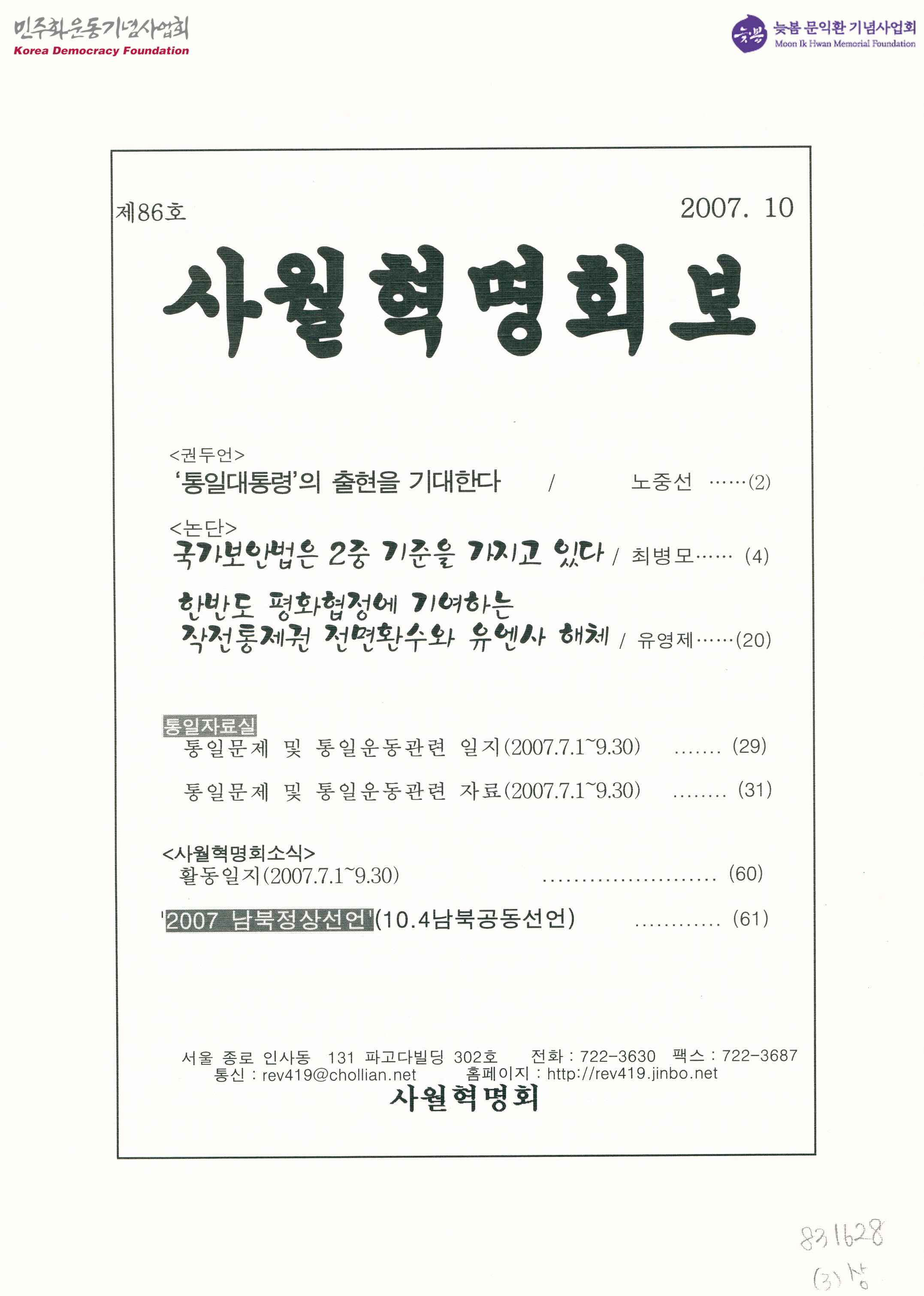 - '통일대통령'의 출현을 기대한다 국가보안법은 2중 기준을 가지고 있다 한반도 평화협정에 기여하는 작전통제권 전면환수와 유엔사 해체 통일자료실 사월혁명회 소식 2007 남북정상선언