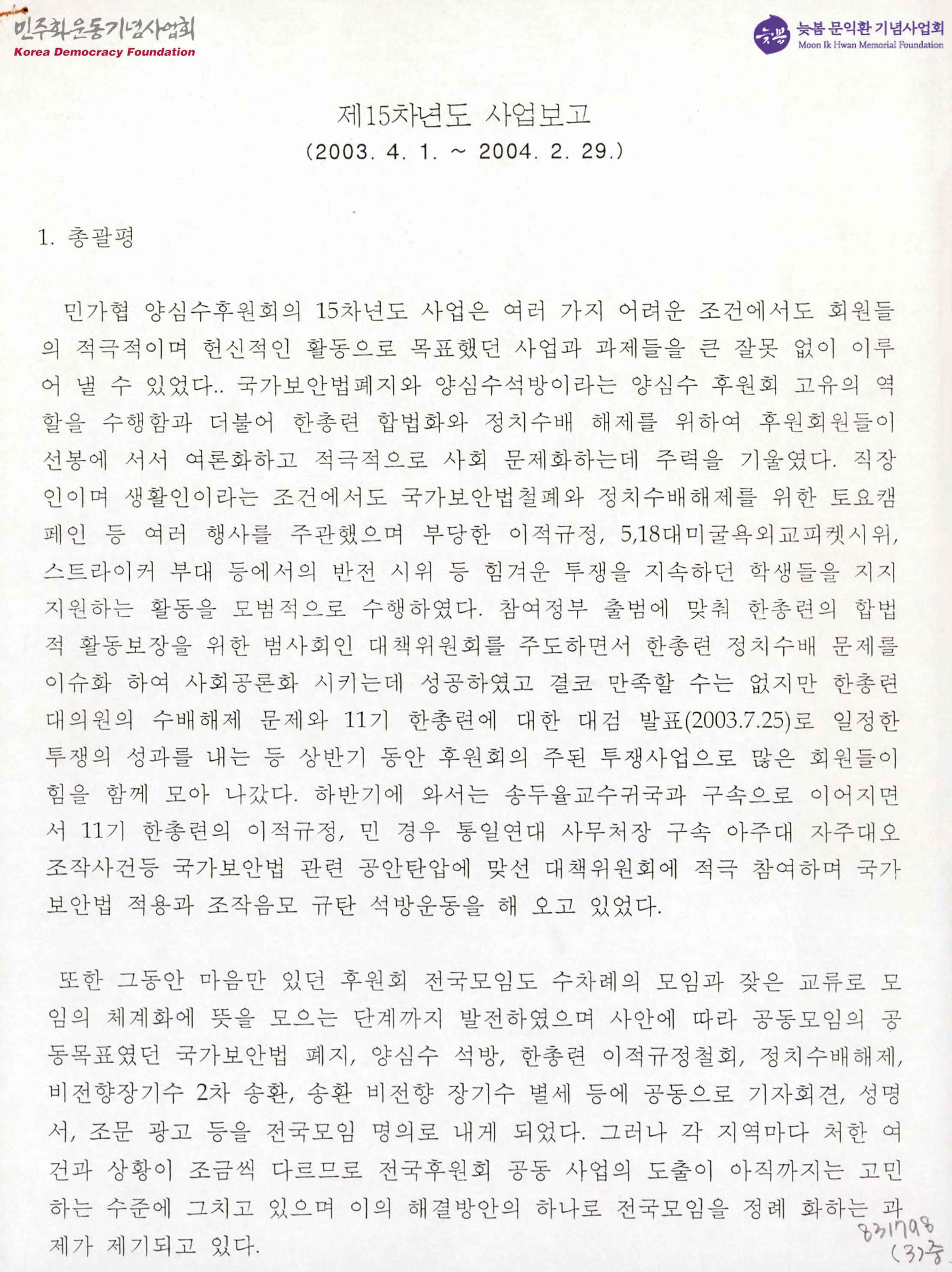 - 민가협 양심수후원회의 15차년도의 사업을 보고 및 평가하고 향후 과제를 밝힘.