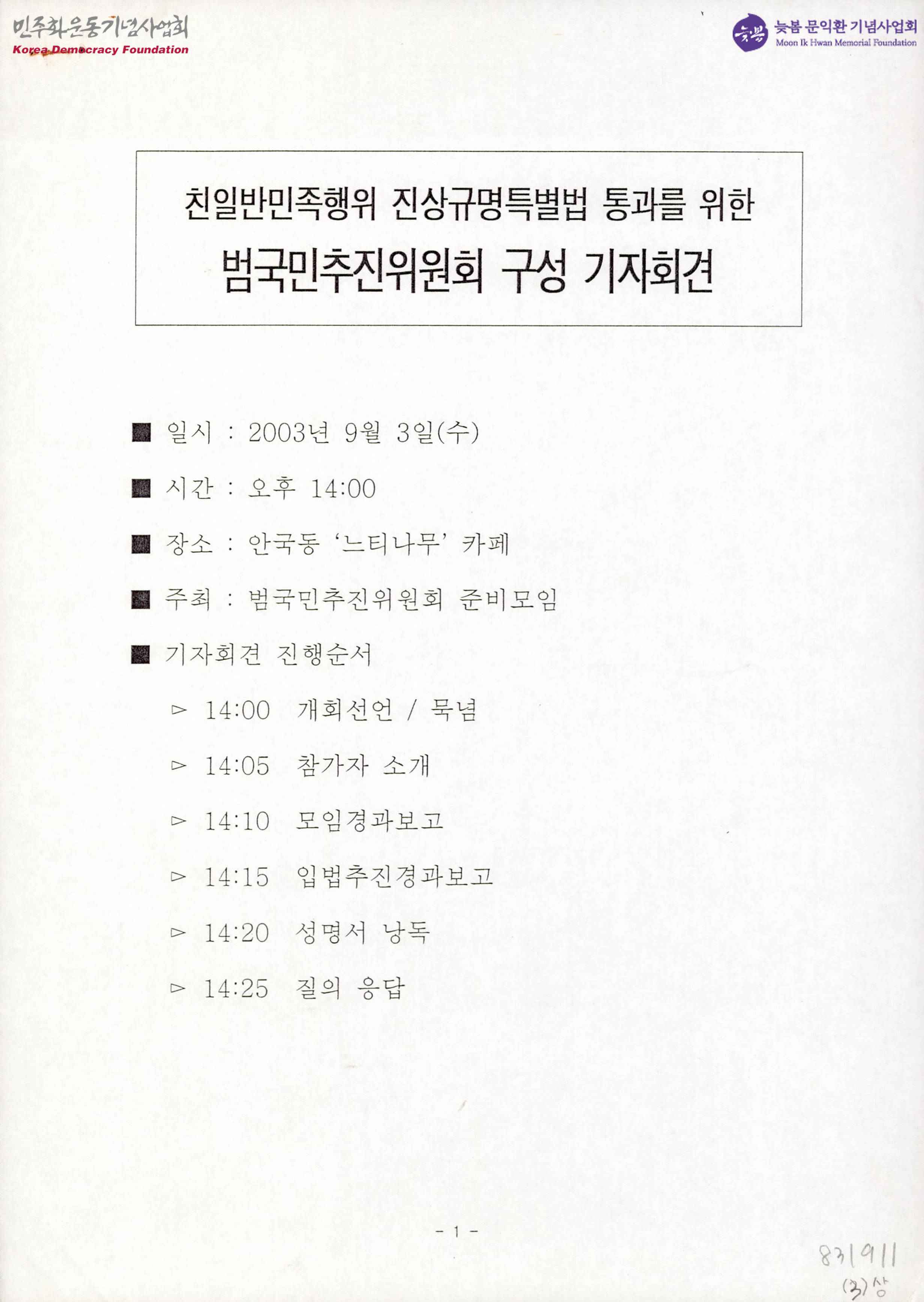 - '친일반민족행위진상규명특별법' 통과를 위한 범국민추진위원회 성명서. 추진위원회 명단.
