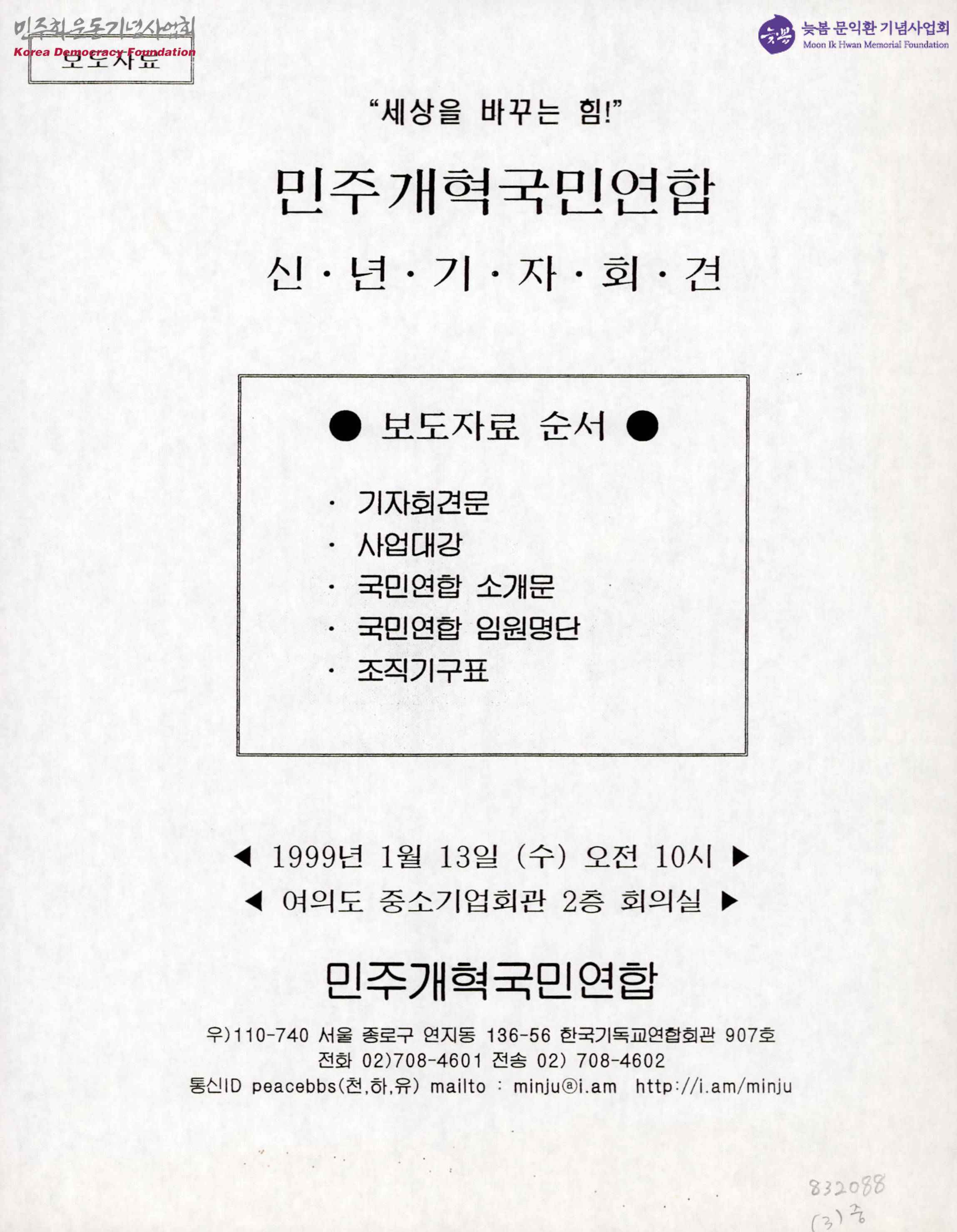 - 민주개혁국민연합의 신년기자회견에 썼던 보도자료로서 기자회견문, 사업, 국민연합 소개문, 국민연합 임원명단, 조직기구표가 설명되어 있다.