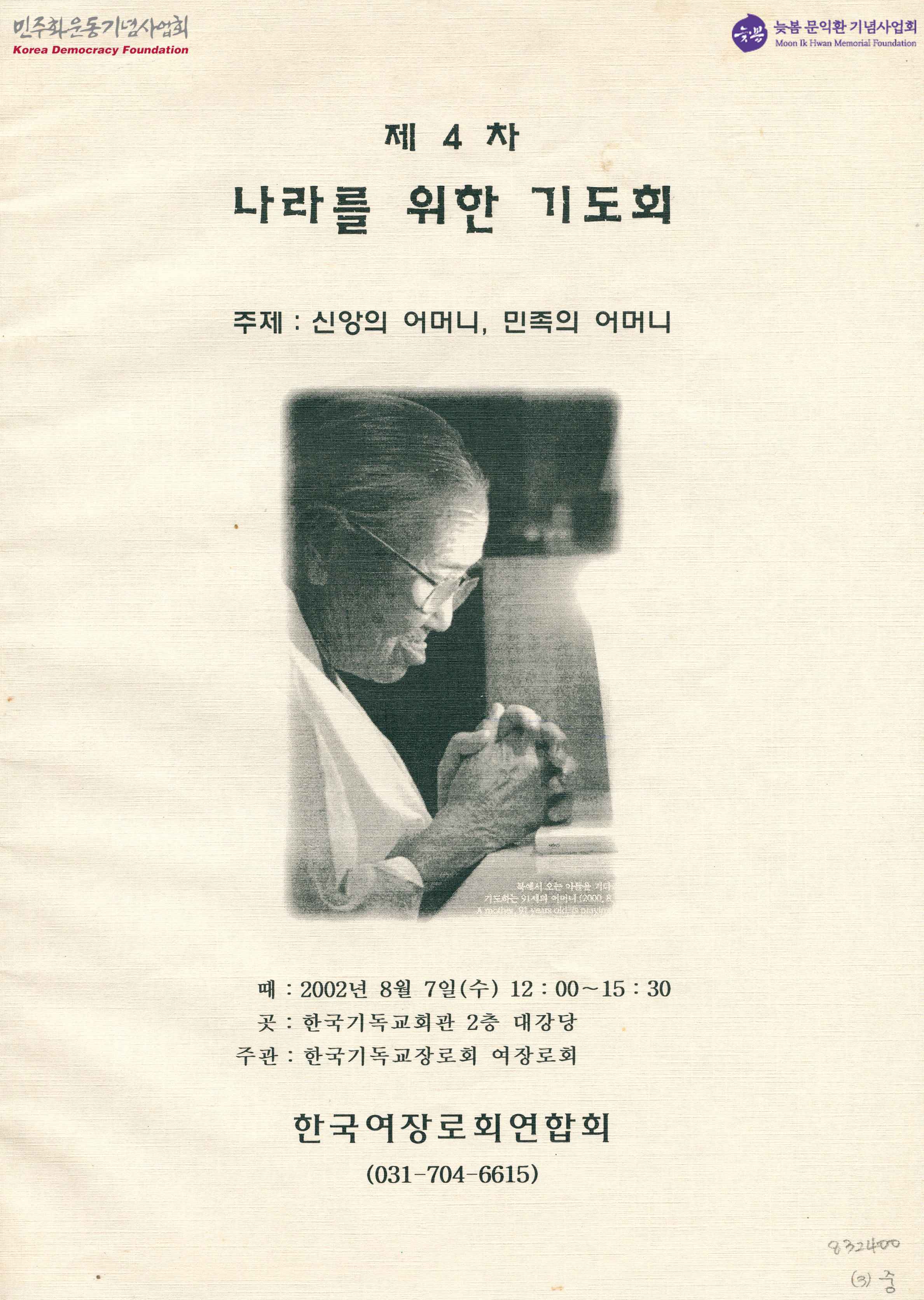 - '신앙의 어머니, 민족의 어머니'라는 주제로 2002년 8월 7일 한국기독교회관에서 열린 기도회의 식순과 사업계획 일정표, 위원진 명단과 연락처 등을 수록한 자료집.
