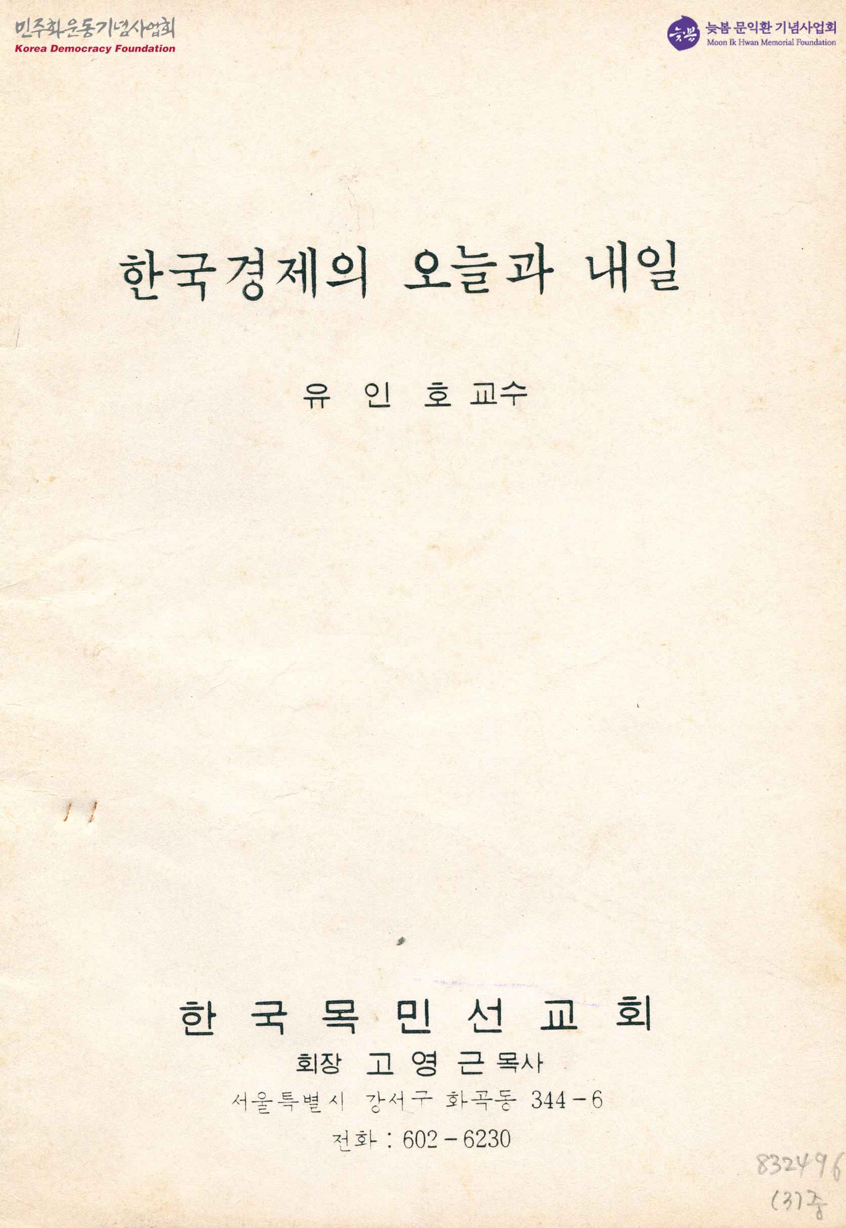 - 한국목민선교회에서 주최한 현대인을 위한 목요교양강좌회에서 유인호 교수가 발표한 한국경제의 오늘과 내일이라는 제목의 소논문.