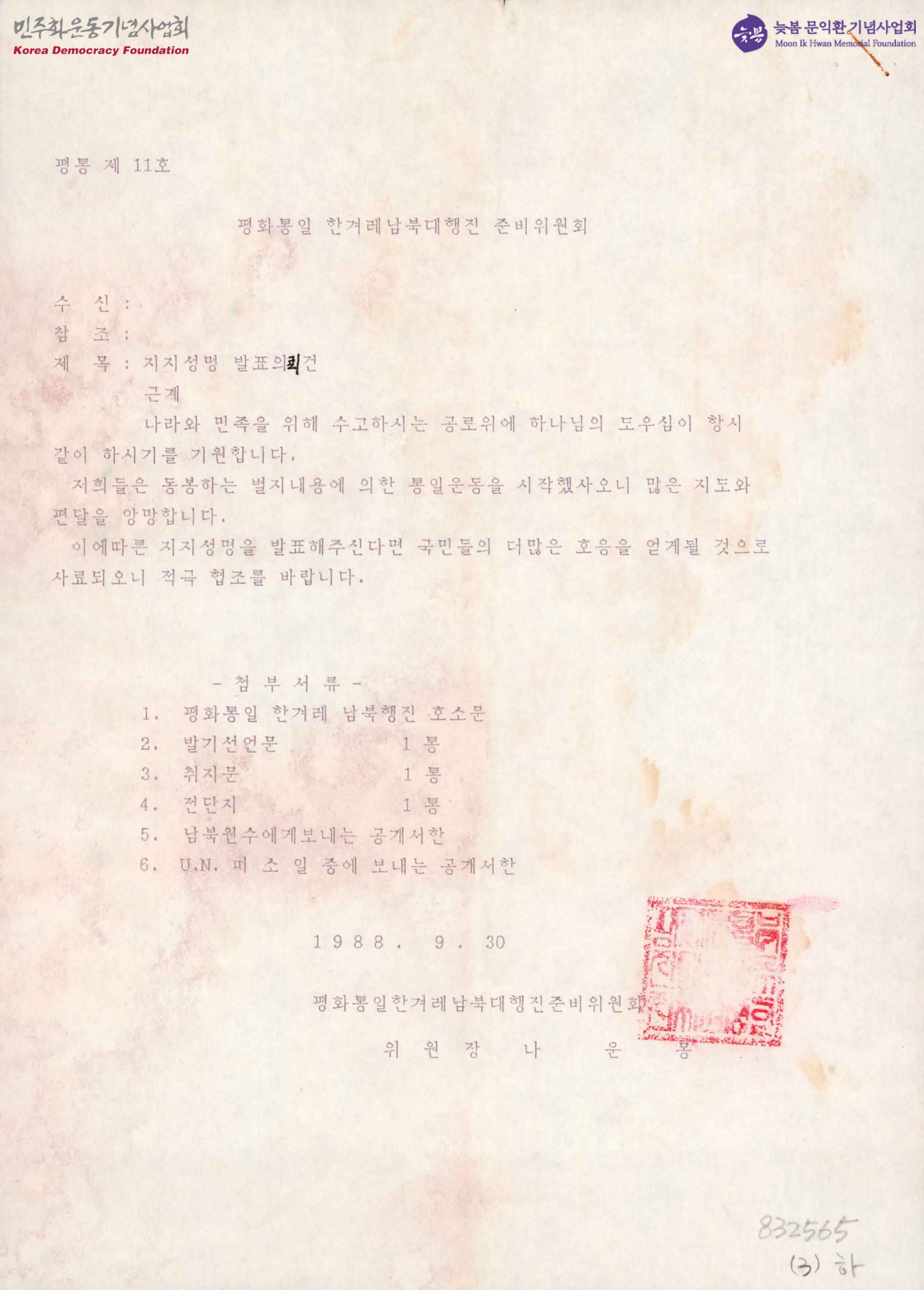- 평화통일 한겨레 남북대행진 관련 자료. 1. 평화통일 한겨레 남북행진 호소문 2. 발기선언문 3. 취지문 4. 전단디 5. 남북원수에게 보내는 공개서한 6. UN 미소일중에 보내는 공개서한