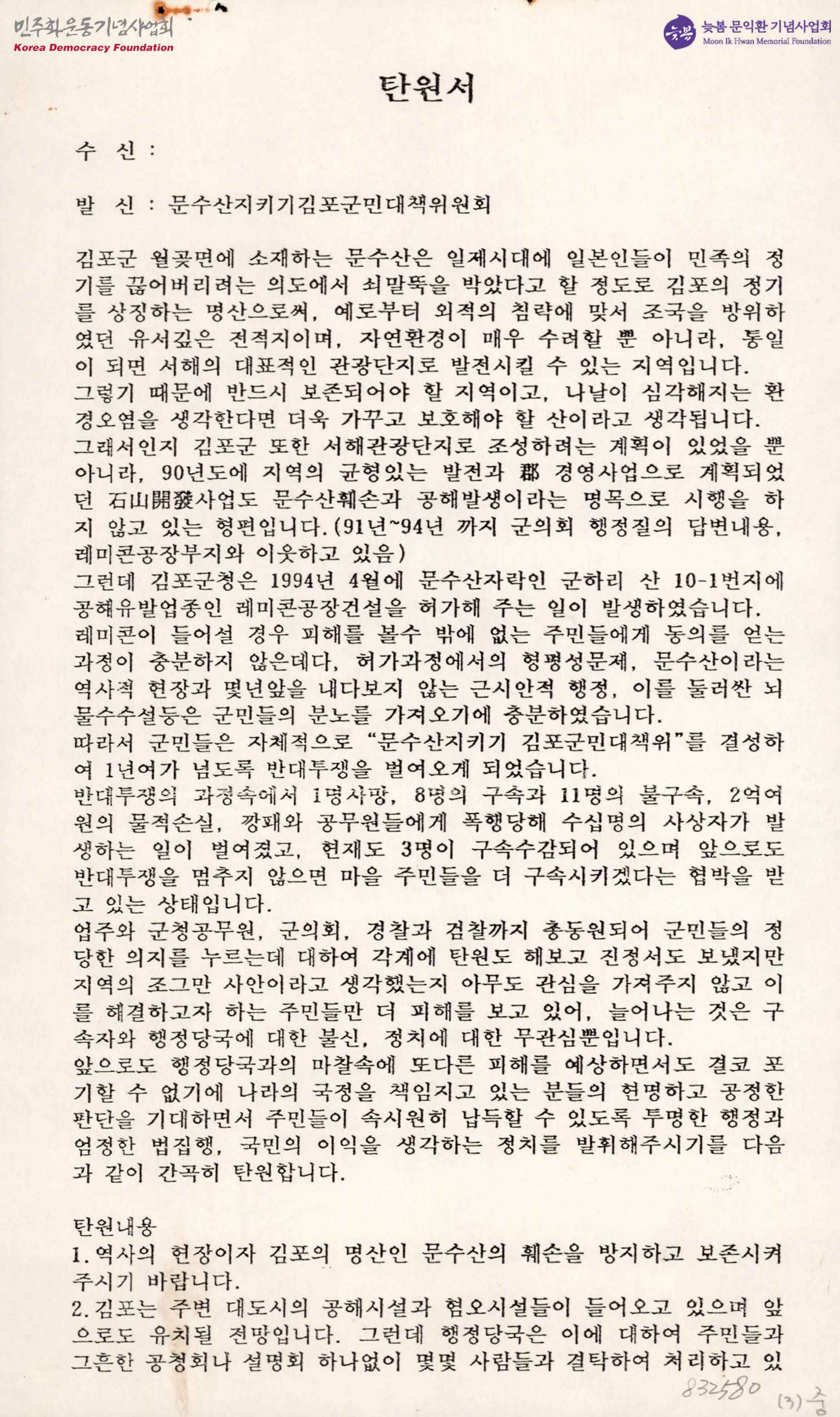 - 김포 문수산 훼손을 방지하고 보존시켜 줄 것을 요구하는 탄원서.