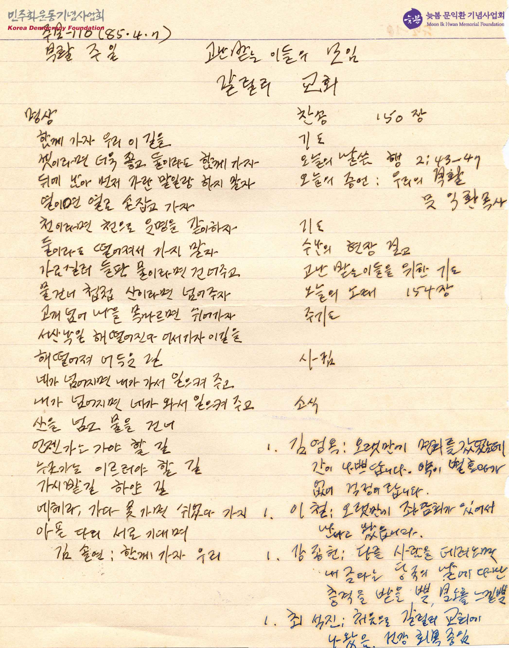 - 명상 찬송 기도 오늘의 말씀 오늘의 증언 기도 수난의 현장 보고 고난 받는 이들을 위한 기도 오늘의 노래 주기도 사귐 소식