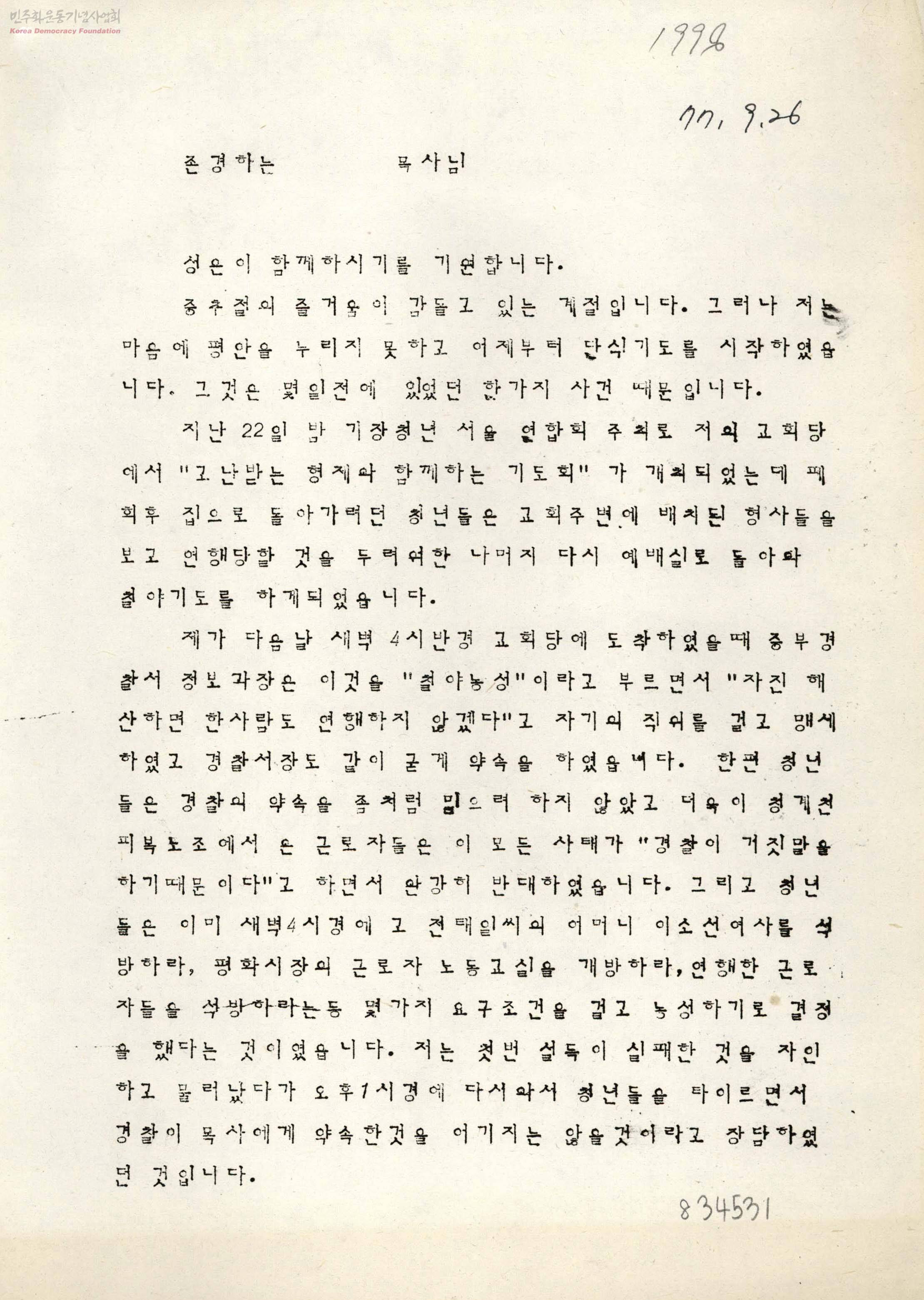 - 경찰에 의하여 탄압을 받는 근로자들의 사정을 자세히 들어보는 기도회를 주최한다.