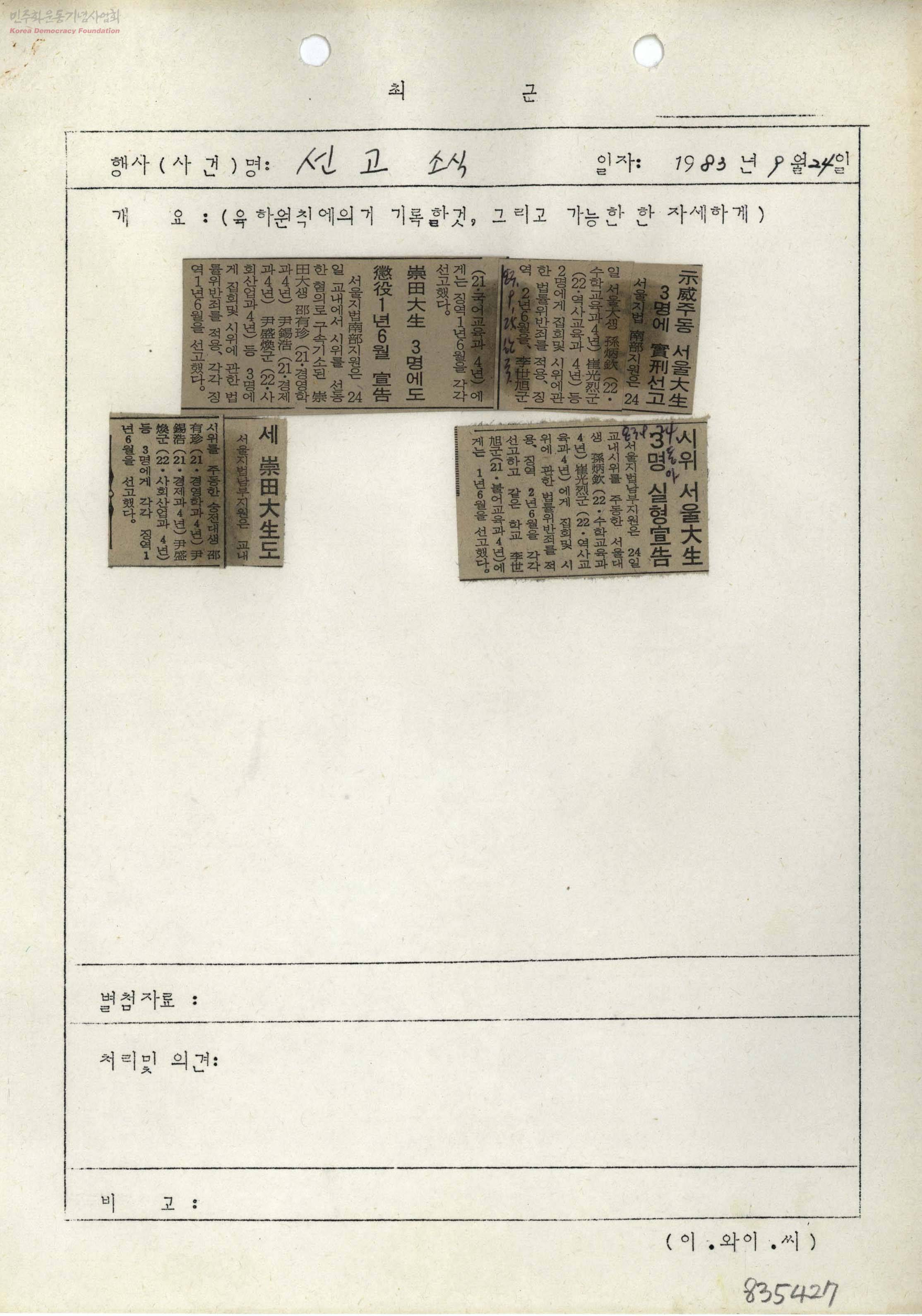 - 80년대 민주화운동을 이끌어가는데 앞장섰던 각대학 학생운동 세력이 학내에서 시위등을 조직하다가 검거되는 상황에 대한 기록의 일부. 신문기사 스크랩-서울대생, 숭전대생 선고 소식