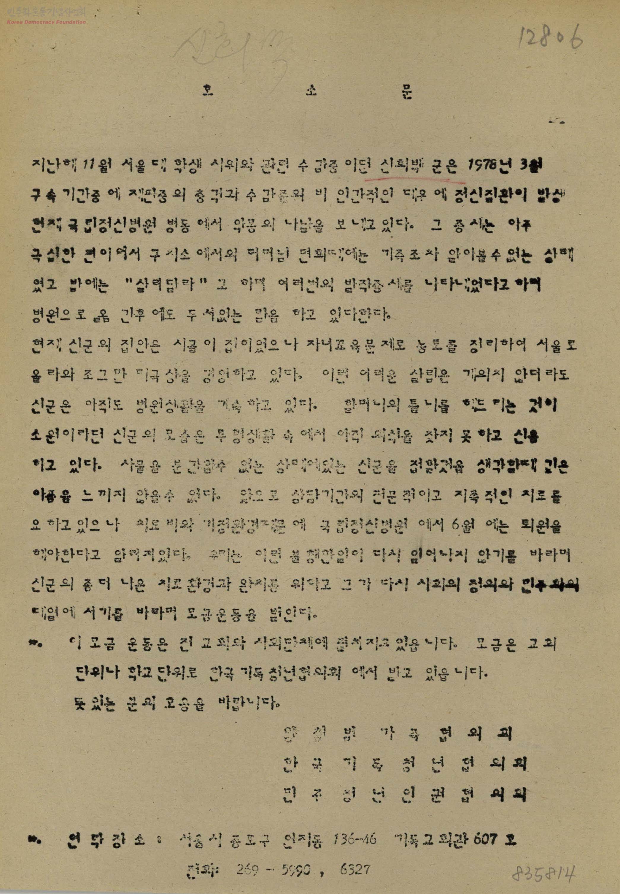 - 서울대 학생 시위와 관련 수감중에 정신질환이 발생한 신희백군의 치료를 돕기 위한 모금운동에 대한 호응 호소