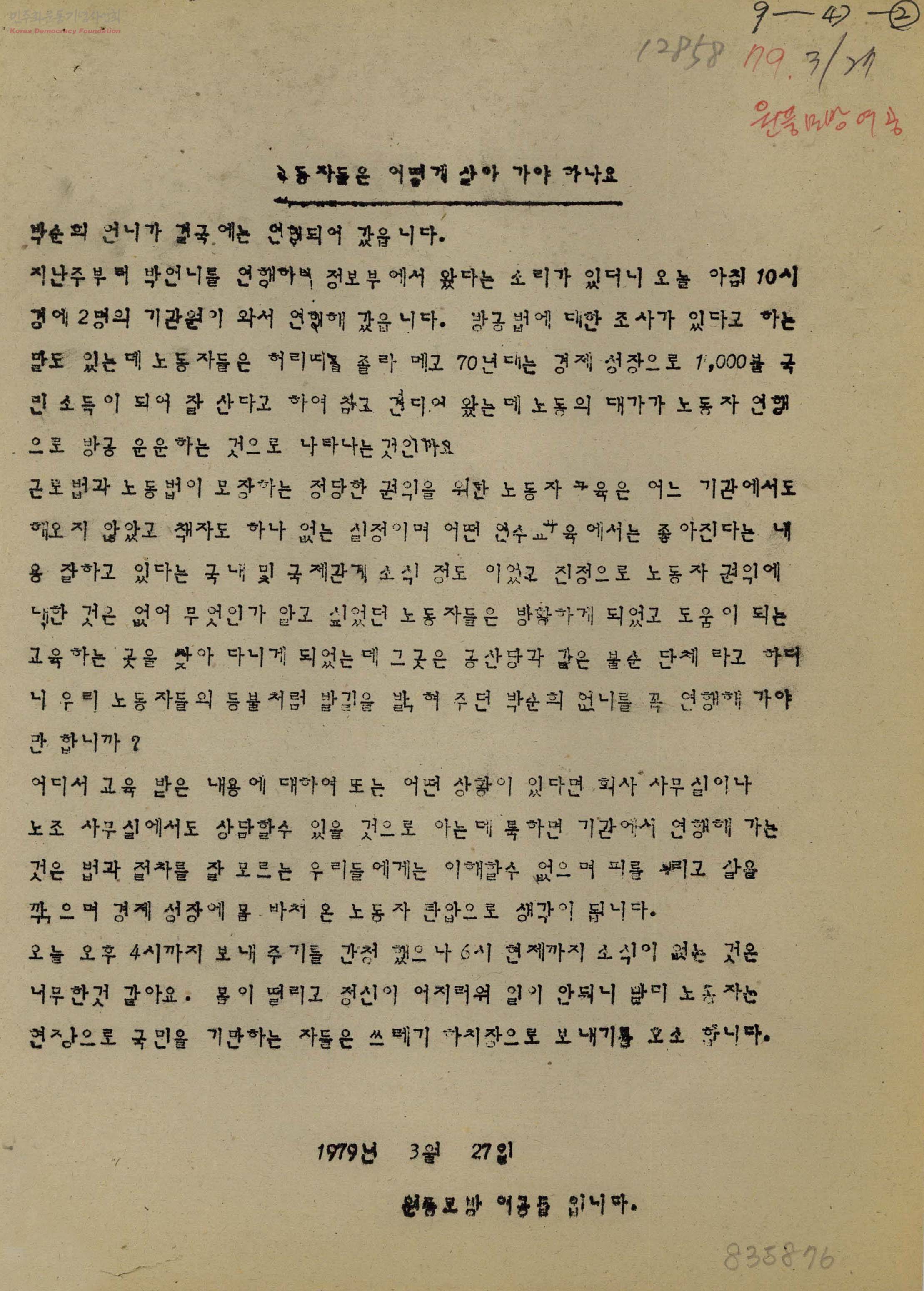 - 방공법 조사를 이유로 연행한 박순희 씨의 석방을 호소