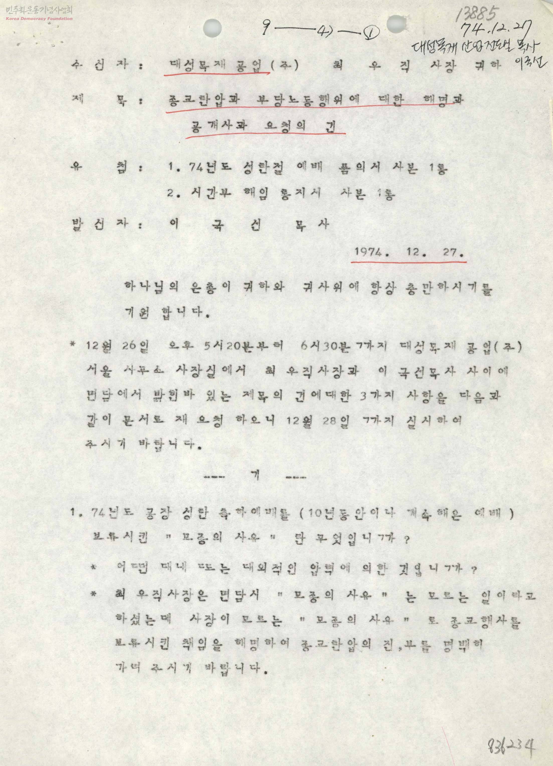 종교탄압과 부당노동행위에 대한 해명과 공개사과 요청의 건[수신: 대성목재공업(주) 최우직]