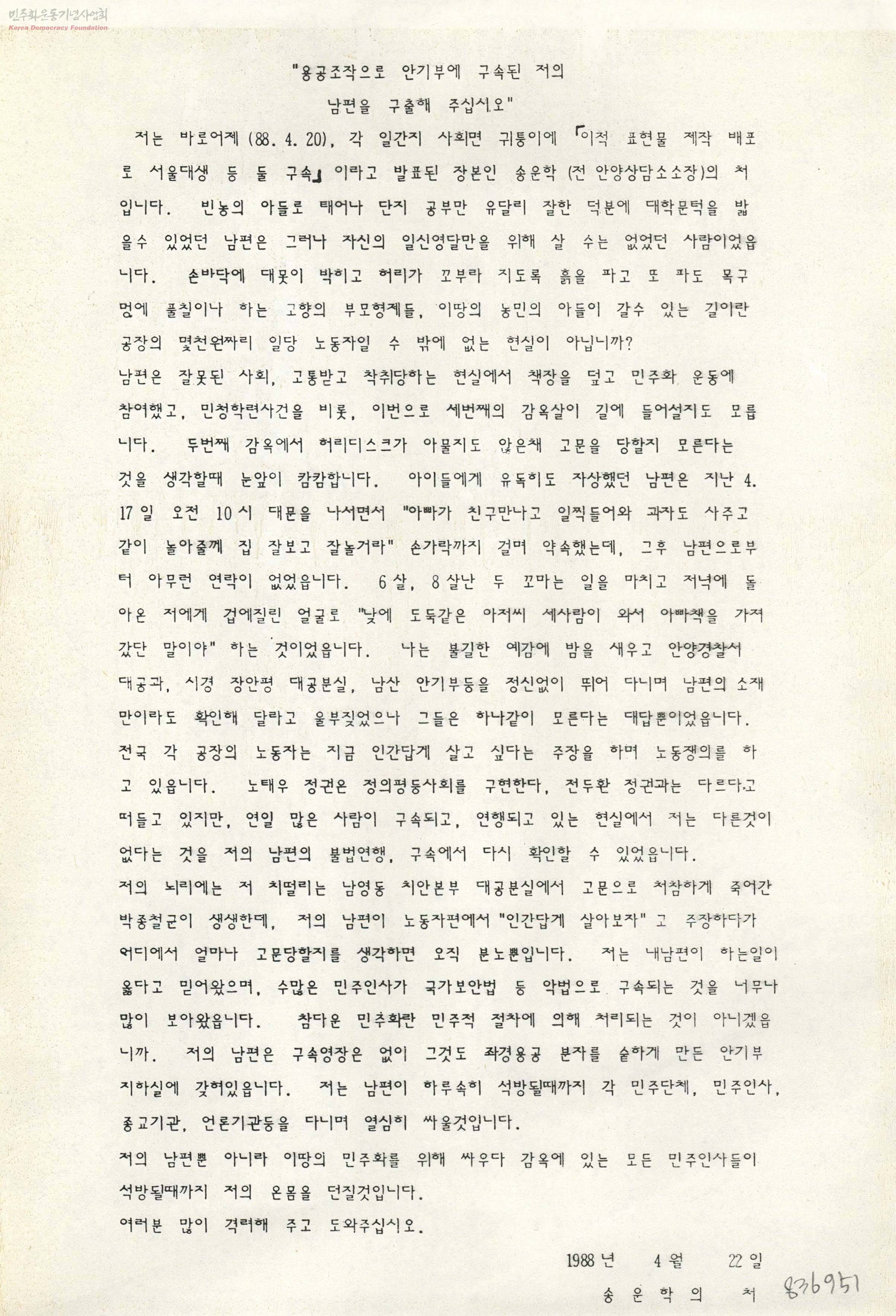 - 88.4.20, '이적 표현물 제작 배포로 서울대생 등 둘 구속'이라고 발표된 송운학(전 안양상담소소장)의 처가 구속영장도 없이 좌경용공분자가 되어 안기부 지하실에 갖혀있는 남편의 석방을 호소.