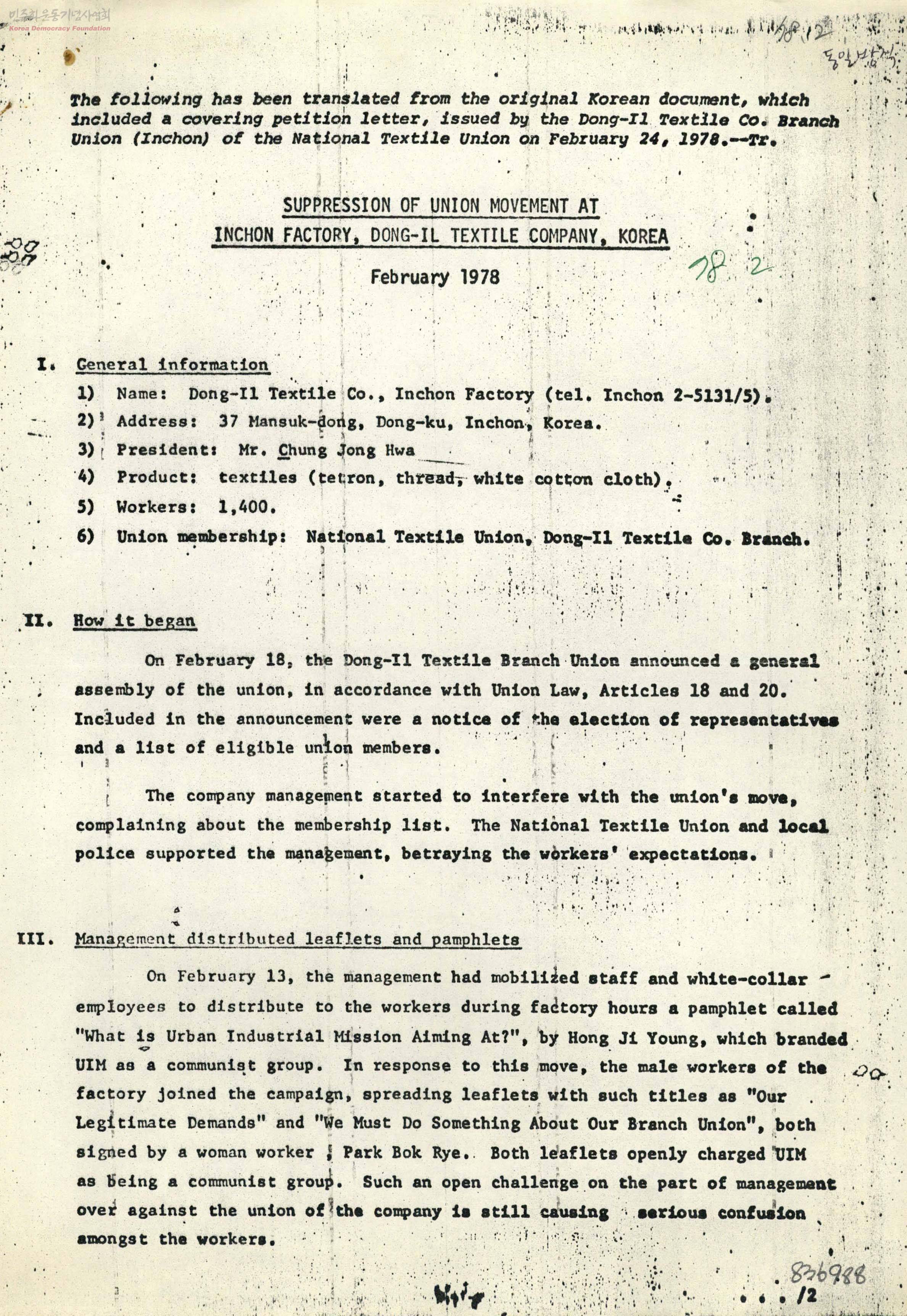 SUPPRESSION OF UNION MOVEMENT AT INCHON FACTORY, DONG-IL TEXTILE COMPANY, KOREA