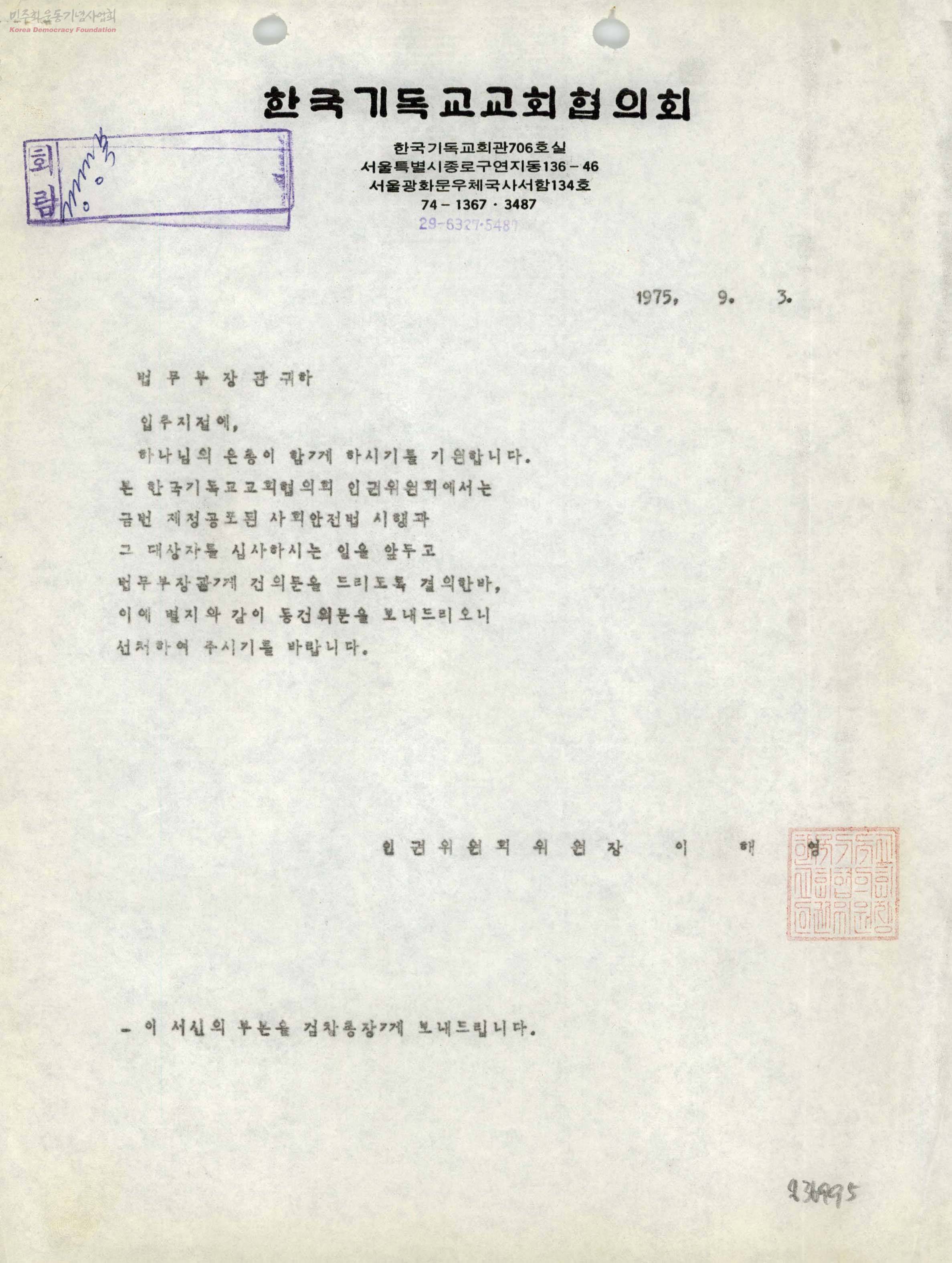 - 사회안전법 시행과 관련하여 법무부장관과 검찰총장에게 선처하여 주시길 바라는 공문과 법무부장관에게 드리는 건의문.
