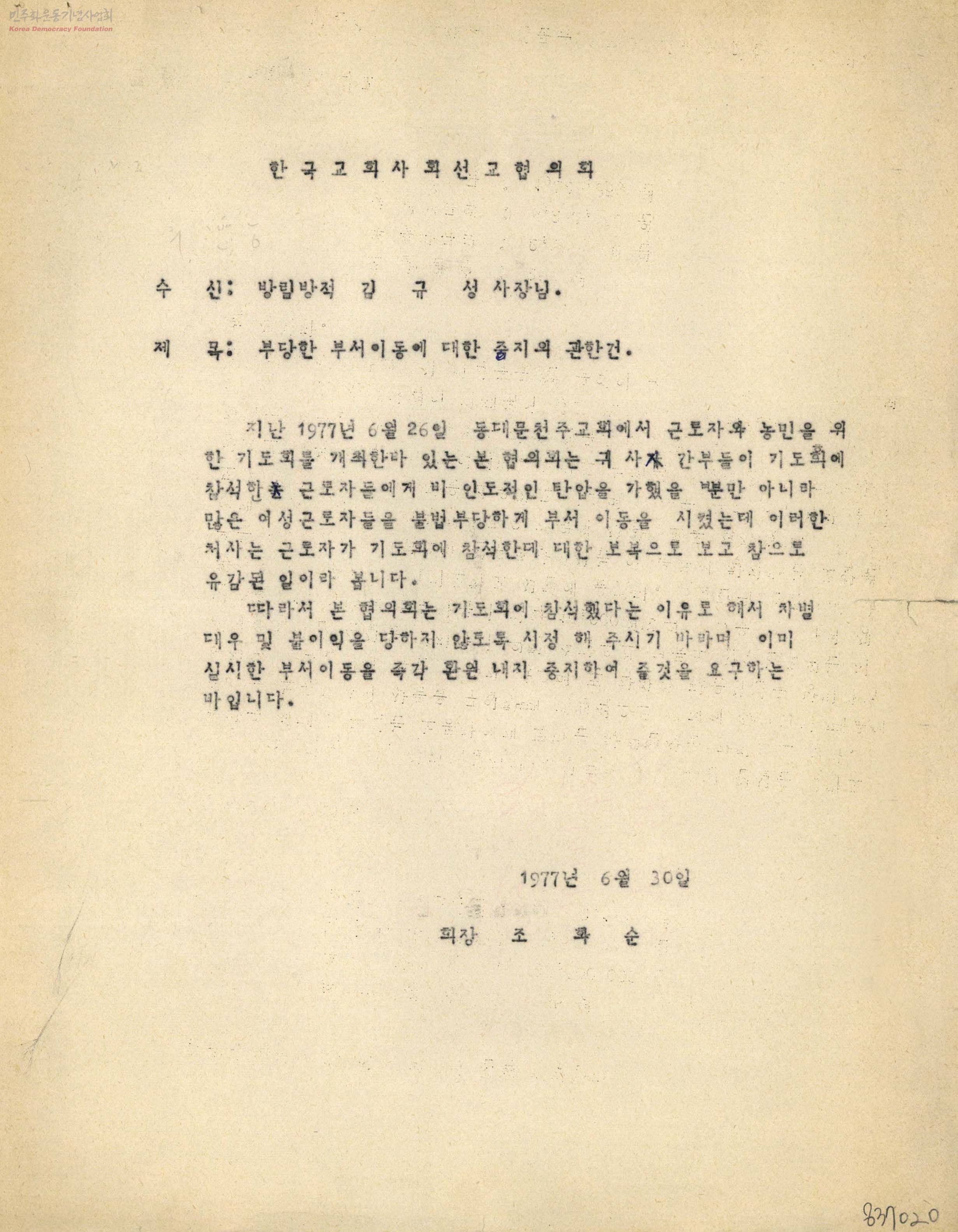 부당한 부서이동에 대한 중지의 관한 건[수신:방림방적 김규성 사장, 발신:한국교회사회선교협의회]