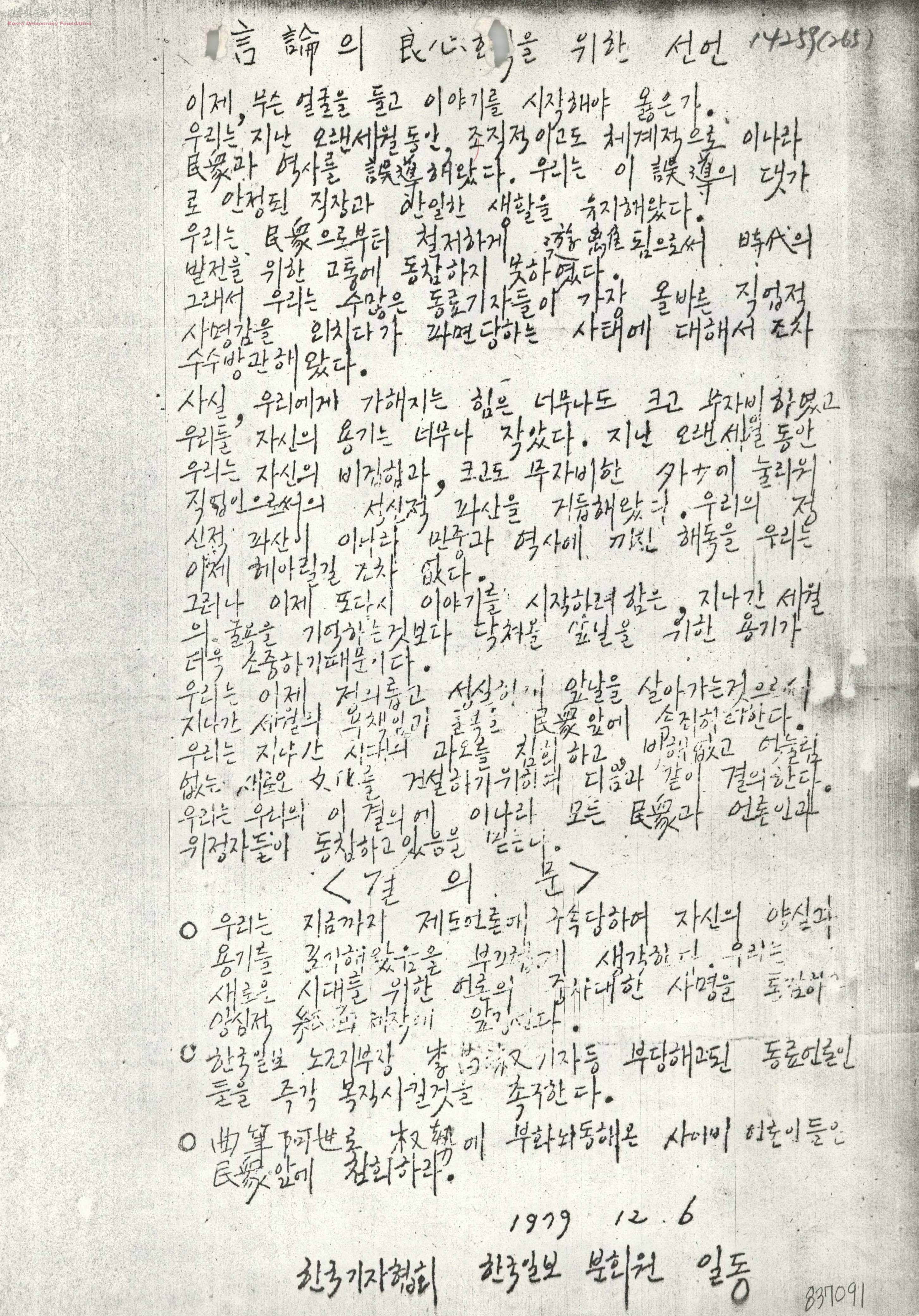 - 제도언론에 구속당하여 자신의 양심과 용기를 포기해왔음을 부끄럽게 생각하며, 새로운 시대를 위한 언론의 중차대한 사명을 통감하여 양심적 제작을 앞당기고 한국일보 노조지부장 등을 비롯한 부당해고된 동료언론인들을 즉각 복직시킬 것을 촉구한다.