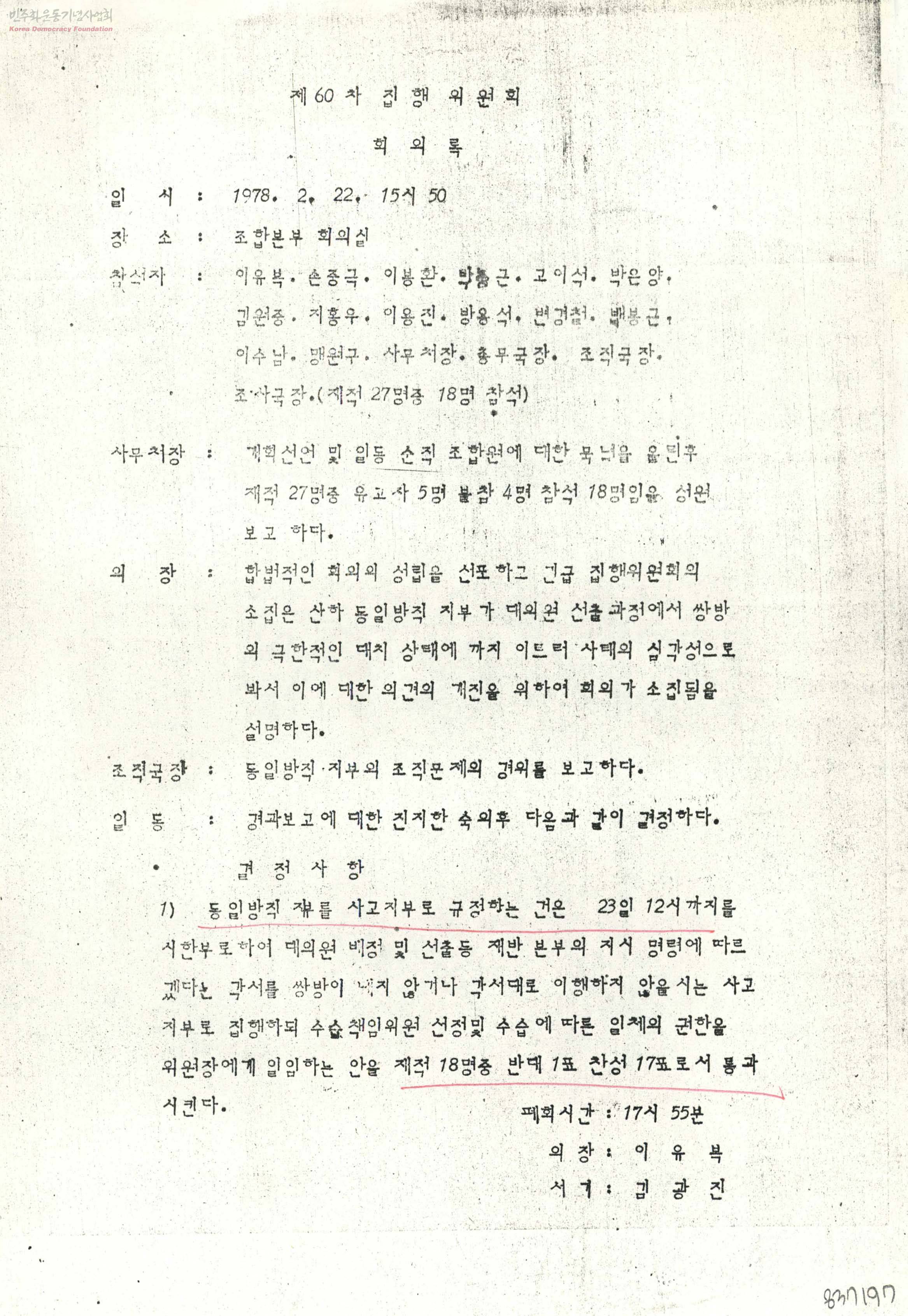 - 동일방직 지부의 대의원선출과정에서 쌍방 대치 상태의 심각성에 대한 의견 개진을 위해 회의가 소집되어 동일방직 지부를 사고지부로 규정하는 건에 대해 논의
