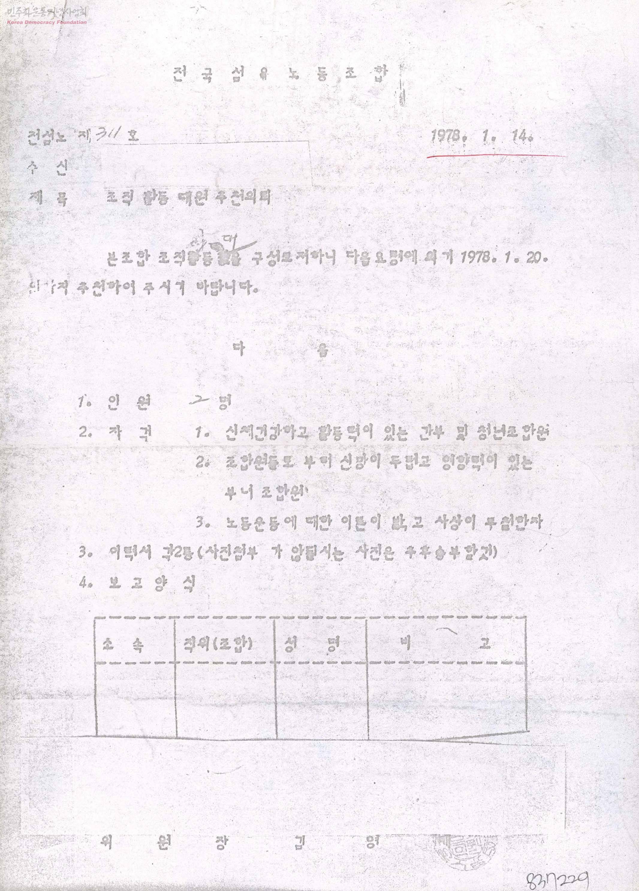 - 7,80년대 군사독재정권의 탄압 속에서도 섬유산업 관련 노동자들의 권익보호에 앞장선 '전국섬유노동조합연맹' 관련 내용 조합 조직활동대를 구성하기 위한 적합한 인물 추천 의뢰