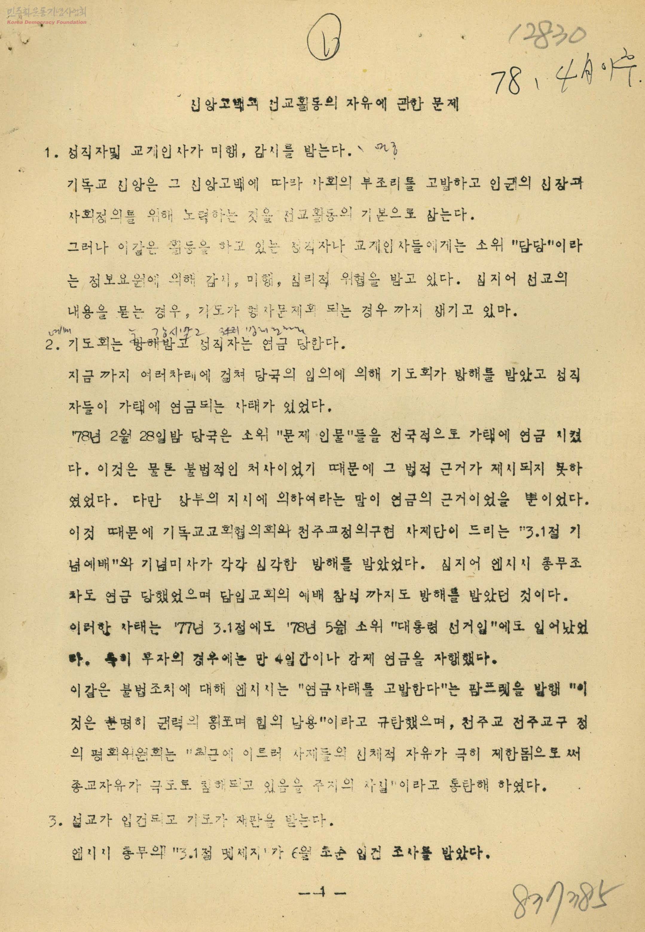 - *민주화 운동의 한 축을 이끌었던 기독교계를 탄압한 군사독재 정권을 규탄하는 내용. 1.성직자 및 교계인사가 미행, 감시를 받는다 2.기도회는 방해받고 성직자는 연금당한다 3.설교가 입건되고, 기도가 재판을 받는다 4.성경이 재판을 받는다 5.교회집회는 감시를 받는다 6.정치보복이 성직자에게 가해진다 등