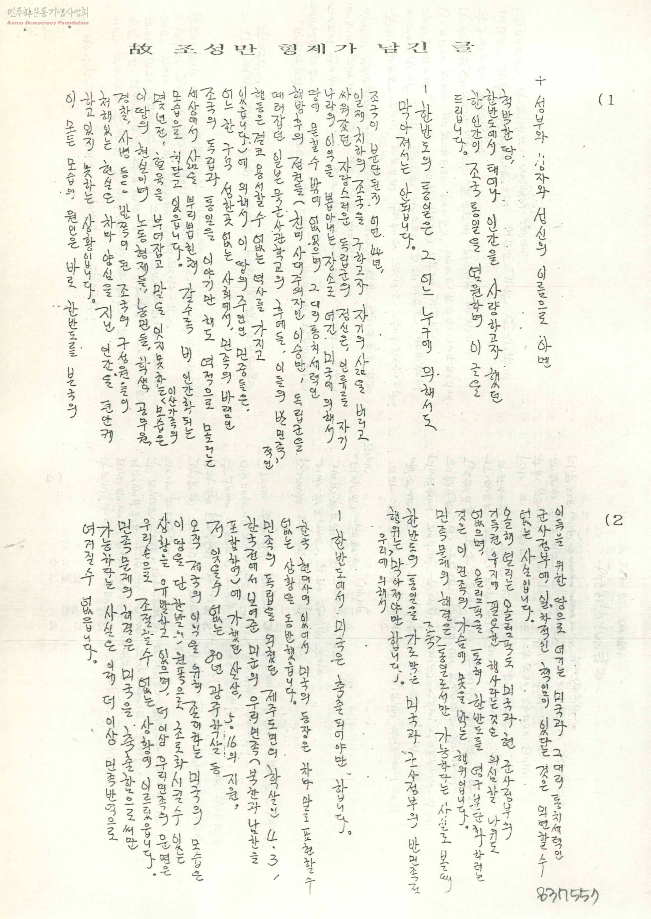고 조성만 형제가 남긴 글